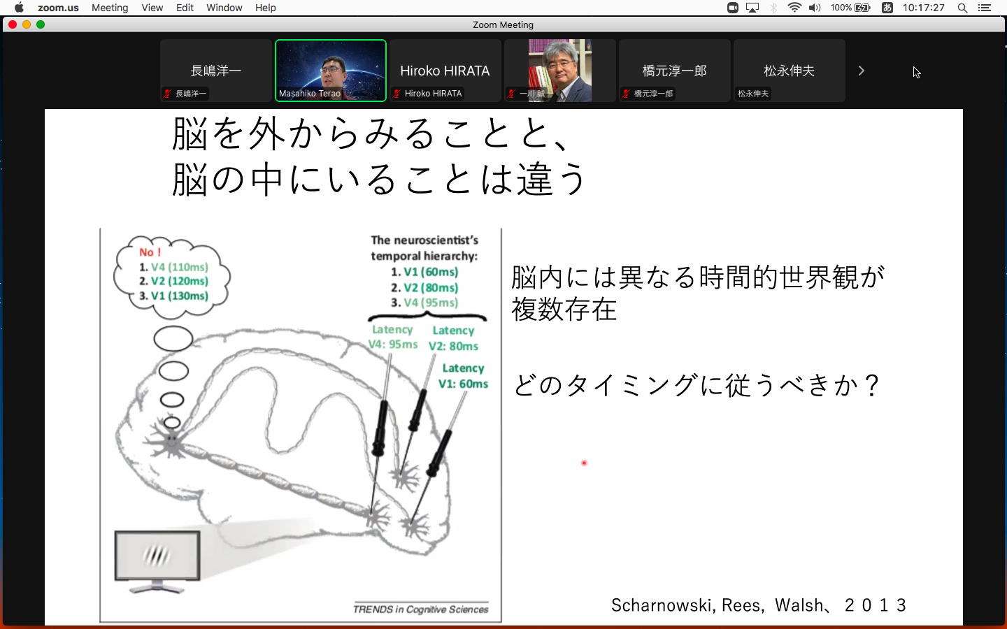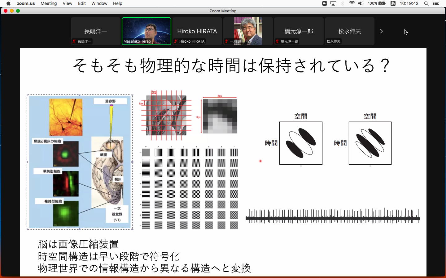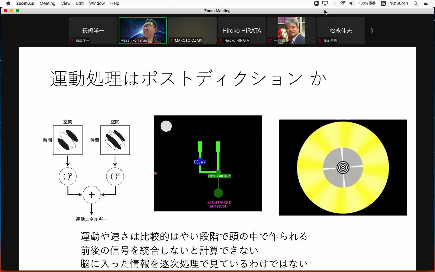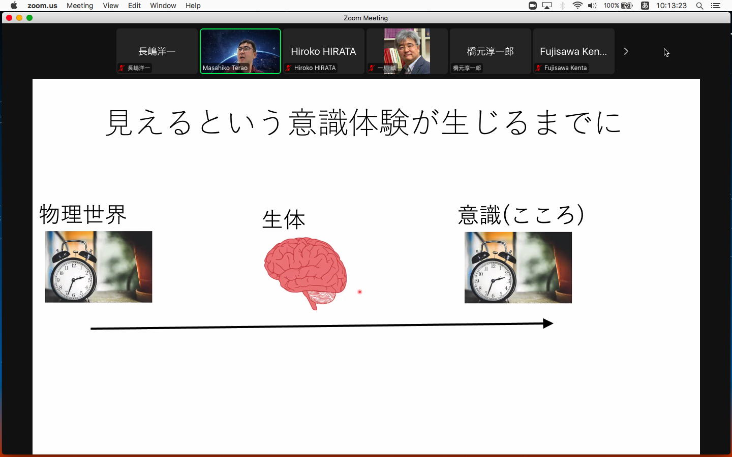 また、グラフィック系の日比谷先生とかわ先生への依頼として、学会発表論文に入れるイラストとして、絵心のある学生に手伝って欲しい・・・というメイルを出した。 We-mode認知の紹介のところで使いたい「両引き鋸」のイメージスケッチであるが、果たして協力してくれる学生が現れるかどうか、期待して待つことにした。 そして2限のゼミZOOMミーティングは、1106にやってきた東本クンを含む、以下のような4人で開催された。 ちなみに(リンク切れするが)全73分の記録動画は これ である。 皆んなそれぞれの近況と元気な顔を交換し、それぞれのテーマなどを提供し議論して、いよいよ新学期のゼミがスタートした。