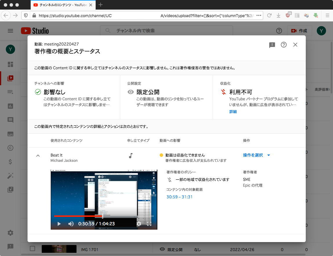 ちなみにこのゼミZOOMミーティング動画をYouTubeに上げてみると、上のようにYouTubeから「著作権の申し立てにより、動画は収益化の対象外となっています。この措置が誤りであると思われる場合は、詳細を確認のうえ異議申し立てを行ってください。異議申し立てが解決されるまで、収益は別途で保留状態になります」というのが自動で表示された。 「使用されたコンテンツ : Beat It - Michael Jackson」、「著作権者 : SME (Epic の代理)」とのことで、ただし結論としては「この動画の Content ID に関する申し立てはチャンネルのステータスに影響しません。これは著作権侵害の警告ではありません」とのことだった。 これは王さんの試作したProcessingスケッチをゼミの皆んなで見た後に、音楽を切り替えてみる実験として僕のパソコンに入っていた" Beat It"を指定して、確かに音楽の雰囲気が違うと分析/生成されるライヴ・グラフィクスもだいぶ違ったね・・・という時のものだった。 さすがのYouTube自動検出機能だったが、まぁ僕のページは何も収益化していないOpenSourceなので、まったく無問題である。