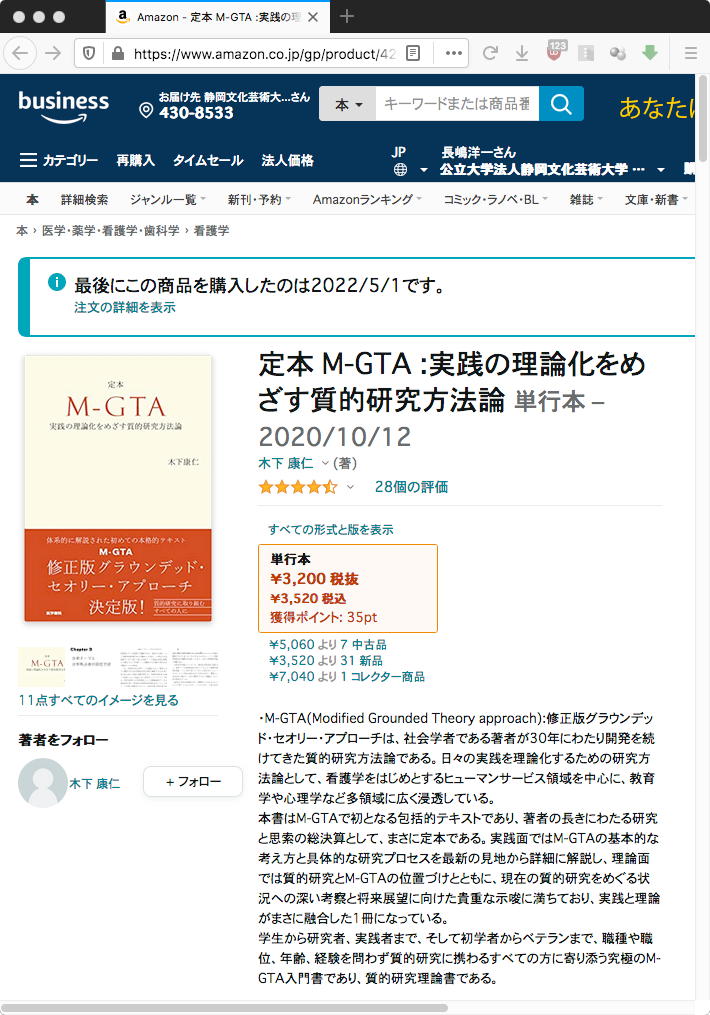 音知学会の原稿執筆が難航している理由は、その中に書かれていた「M-GTA」という謎の研究手法である。 そこから始まって、ネットを検索して 11本の資料 を探し出して印刷して精読(いい時代である(^_^))、そして遂にはその元本として以下の本をAmazonに発注することとなった。 これまでの「研究」とは全く概念が異なる、こんな「研究そのものに対する哲学」みたいなものがあったのだ(まったく無縁で生きてきた!)・・・というのは、まさに「知の興奮」である。 これまで触れてきた心理学の世界はまだまだ「理系」だったようで、それよりさらに「文系」の心理学の領域(看護・保健、医療、リハビリテーション、ソーシャルワーク、介護、教育、臨床心理などヒューマン・サービス領域)で活用できるようだが、そうなればこのところの共同研究テーマ(ウェルネス・エンタテイメント)とも密接に関係しているので、ここは本腰を入れて勉強する意味がある。