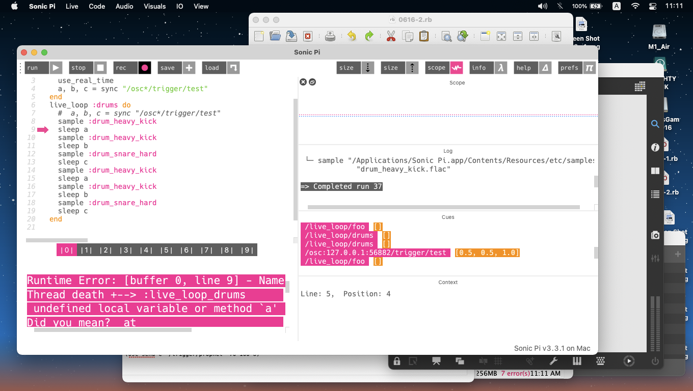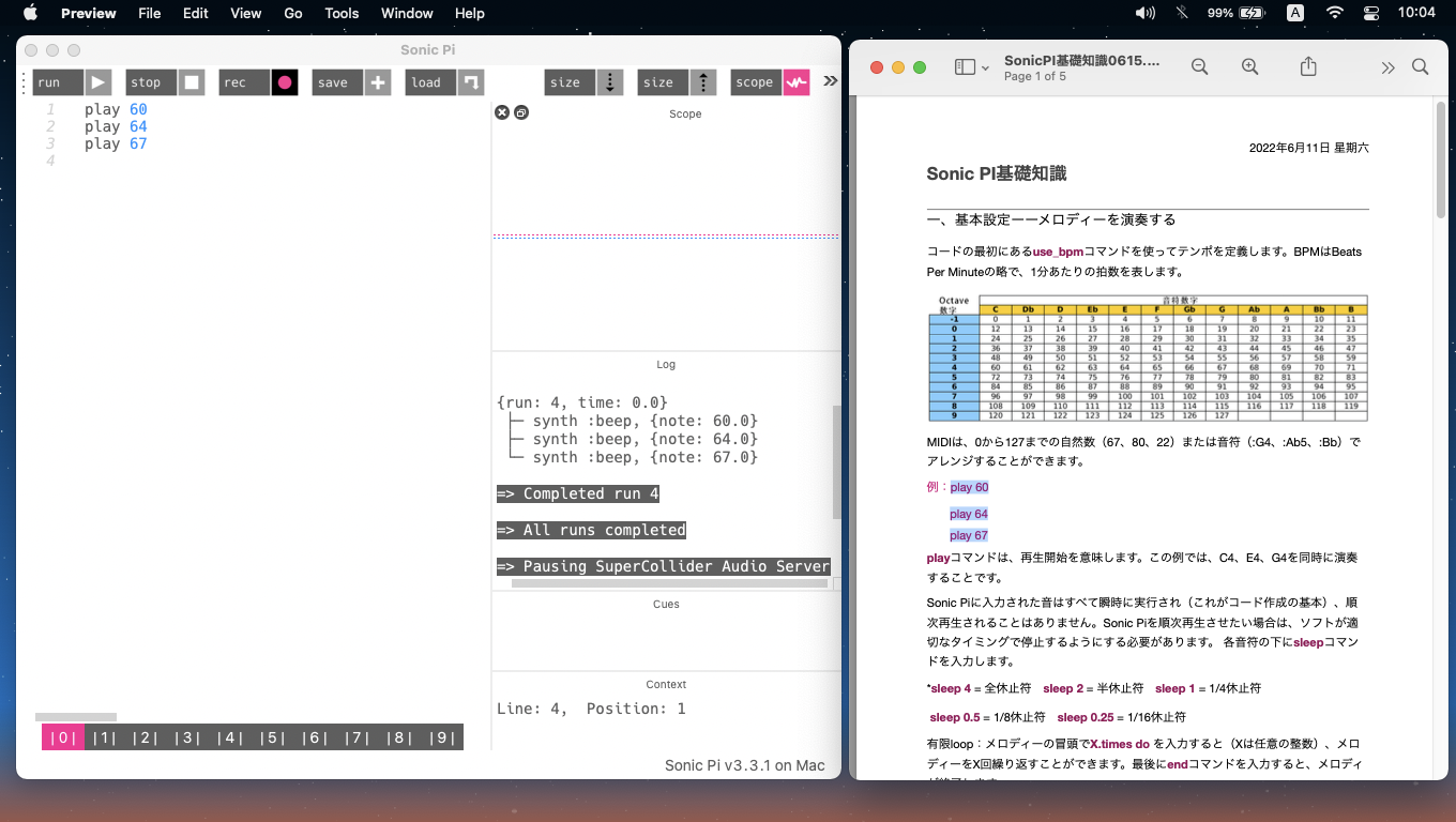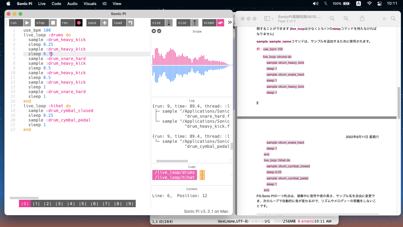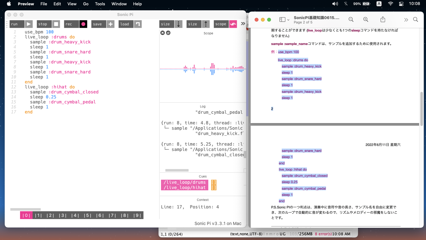 怒涛の学期末が終われば、もう東北大での電子情報通信学会・応用音響研究会での発表に向けた準備となる。 だいぶ前に学会に提出していた 論文 は完全に忘却の彼方にあって、慌ててプリントして思い出しに努めた。 Max8とSuperColliderとProcessingとSonic-Piをデモするためには、いつものMacBookAir(OSX10.11.6)ではSonic-Piが走らない(;_;)ので、久しぶりにM1MacBookAirを出してきたのだが、どうもProcessingでminimのライブラリのサンプルデータへのpathが通っていないトラブルに遭遇した。 過去のシステムからアプリ一式をHDD経由でコピーしたのが敗因のようで、いったんProcessing環境を消して新たにインストールする必要があるらしい。 しかしその手間が面倒だったので、Sonic-Piは画面だけスクリーンショットで紹介することにして、いつものMacBookAir(11インチ)を持参することにした。 Mozziの話題も書いていたことも発見して、慌てて荷物にデモ用のMozzi一式(ArduinoUNOのシステムでなくて、ArduinoNanoで作った以下のシステム)を追加した。