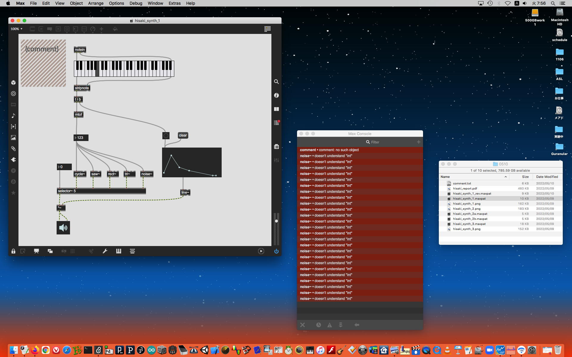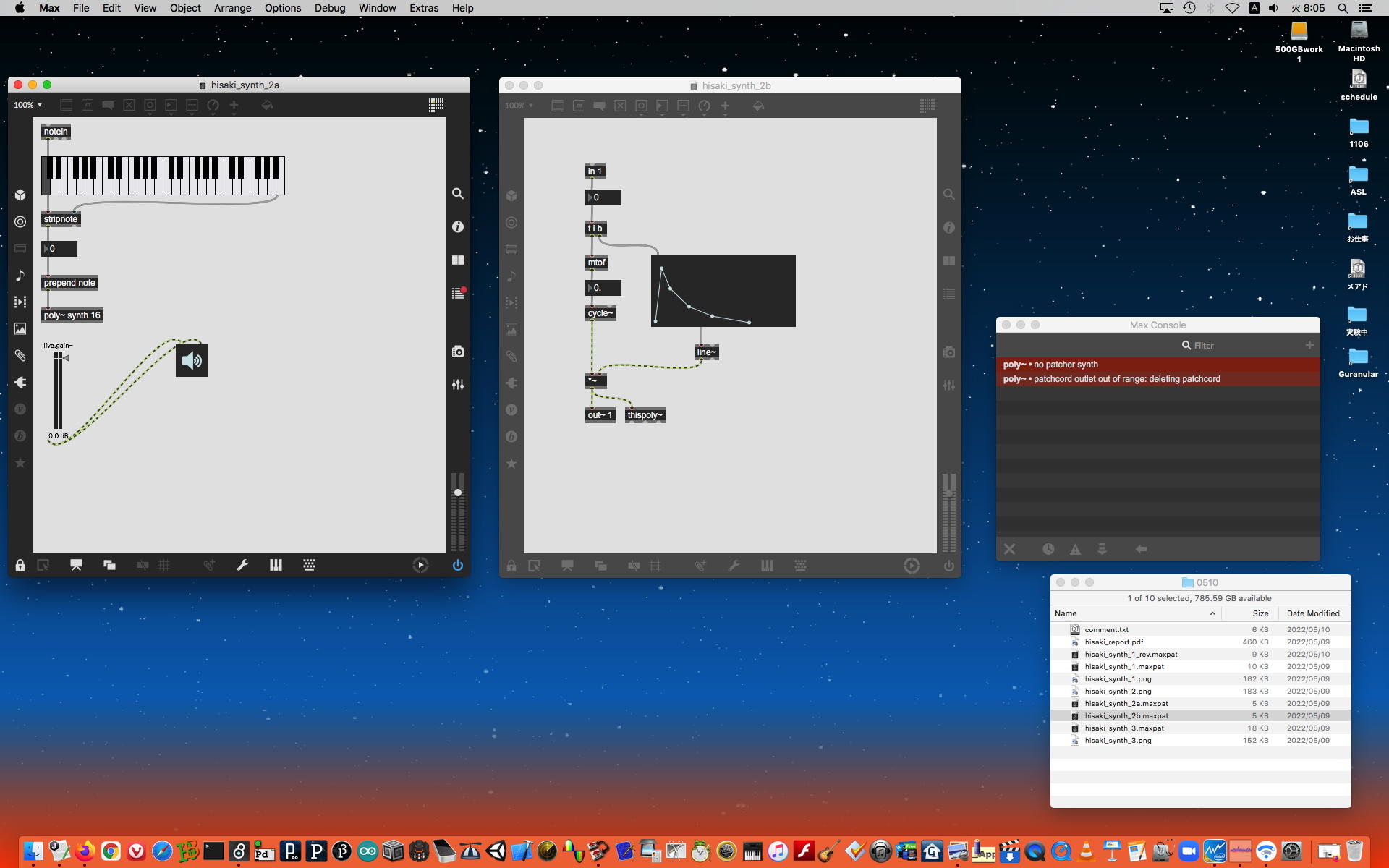 この日の午前は「領域専門演習」の日崎クンのアポが1-2限を埋めていたが、寝坊で1時間ほど遅刻してスタートとなった。 メイルで9時過ぎに「ちょっと遅れる」と連絡があったからいいものの、無断遅刻が続けばクビ、というのは「虎」からの伝統なので、昨今ではハラスメントとか五月蝿いものの、無断遅刻が続けばクビである。 そして、先週に貸し出したLittieBitsSynthを使って このように 作ってきた実験試作の写真と動画を確認しながら、それをMax8版で・・・ということでその場でアドリブで こんなパッチ を作って提供した。 来週は連休なので、その翌週までの宿題として「ネット上の[Max8でサウンドシンセシス]のお勉強サイト」の調査、というのを出してみた。 なんせ3回生からと出遅れて「サウンドデザイン」と「音楽情報科学」も同時履修ということで、あれこれ予習と復習がごちゃごちゃになるのだが、まぁ回り回って全ては生きてくるので、ここは頑張ってもらうしかない。