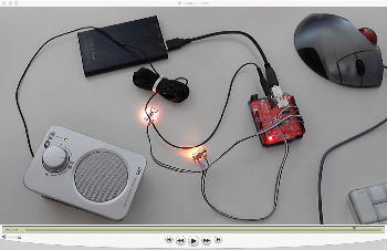 これだと、左右のLEDを同じパターンで点灯させる(鈴木さんにメイルで確認→OK)としても、空いているピンは「5」と「10」だけであり、ホストにシリアル送信をしないのであれば「1」(TX)が使えるものの、今回はマイク入力のスレショルドをシリアルモニタでチェックするためにこれも駄目なのだった。 また、PWM出力によく使う「9・10・11」ピンは、「The Arduino's three SPI data and clock pins -- D11, D12, and D13 -- can be used to interface to other SPI components. They can't, however, be used for any purpose other than SPI」ということで、MP3シールドと一緒には使えない。 そして、「Two pins we haven't mentioned yet are D3 and D4, which are connected to the VS1053B's MIDI-In and GPIO1 pins respectively. Use of these pins is optional. They're not required for most MP3-playing functions, including the examples we'll show in this tutorial」という記述を発見して、不要である3ピンのMIDI-Inの基板上のジャンパをカッターで切断することで「3・5・10」の3ピンをようやく確保できた。 同様にGPIOも使用可能なので、MP3シールド搭載の場合にディジタル出力として使用可能なのは「3・4・5・10」の4ピンで、うち10ピンだけがPWM可能というのが、ここで得られた経験則である。