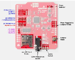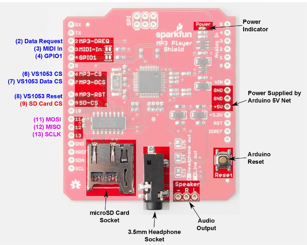 これまで何度となく、「ArduinoUNOにMP3 shieldを載せてサウンドを鳴らす」という作品を「基礎演習E」で支援して制作してきたのだが、実はこれまでたまたますり抜けていた重大な注意点があった。 そしてこの鈴木さんシステムではモロにその問題点に直面したために、土曜の半日(午後はいつものJoyJoyヒトカラ6時間65曲を堪能完走)と、この日曜の午前中に2時間ほどを費やして謎の原因究明に取り組むことになった。 結論から言えば、 MP3 Player Shield Hookup Guide V15 のページまで行って、以下の図を発見したことで解決したのだが、このMP3シールドには重要な注意点があった(占有[予約]ポート多数!)のだった。 たいてい、Arduinoを使ったインスタレーション作品の場合には、スイッチやセンサがあってアナログ入力ポートに繋ぎ、LEDを点灯させる場合にはDigitalポートを使い、PWM点灯させる場合には「3・5・6・9・10・11」の6ポートの中から選んで接続する。 そこで今回の鈴木システムでは、ArduinoにMP3 shieldを載せて、最初は左右で別々にPWM制御するために「3・5・6・9・10・11」を使っていたのだが、謎の現象に悩まされたのだ。 以下の図のように、なんと「2・3・4・6・7・8・9・11・12・13」のポートがこのシールド用として占有されていた、というのをここで初めて知ったのである。
