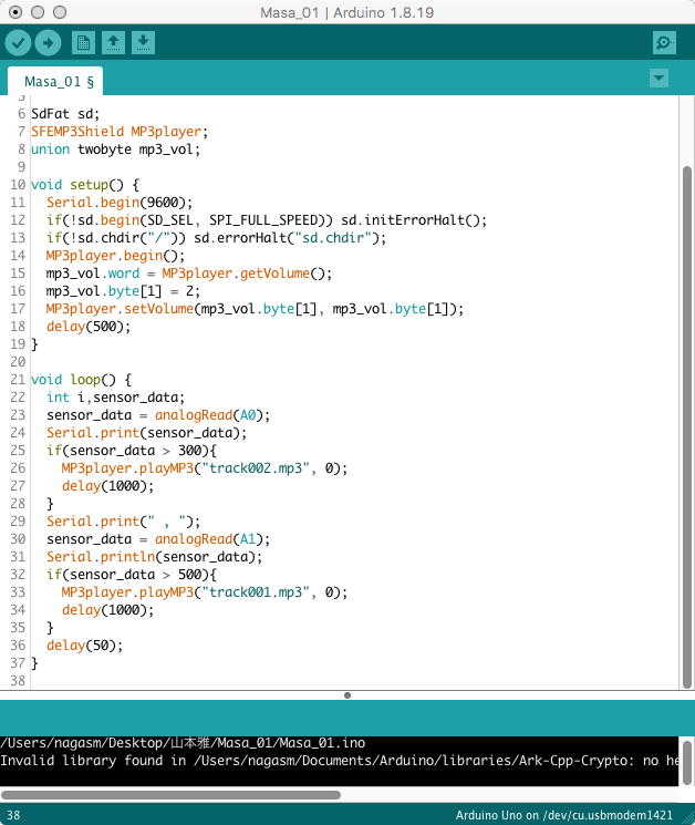 また、ちょうど日崎くんのシステムではArduinoMEGAを使うのだが、MEGAはArduinoシールドが搭載できるものの、上のような注意点があり、無条件にこのMP3シールドが使えるわけでは無い(配線やスケッチの変更、禁止ピンの配慮など)・・・というのも重要なポイントなのでここに付記しておこう。Heads up! The shield was designed with the Arduino Uno R3 with ATmega328P footprint in mind. As with any development board, you may need to reroute pins and convert the logic levels if you are not using an ATmega328P-based board. For example, the Arduino Mega 2560 has SPI pins located on a different part of the board. You will need to reroute the SPI pins and CS has to be declared in code during initialization as pin 53. From user experience, you may want to avoid using pin 2, 6, 7, and 8. Since it is a 5V board, you would not need to worry about any logic conversion.2022年7月18日(月)
