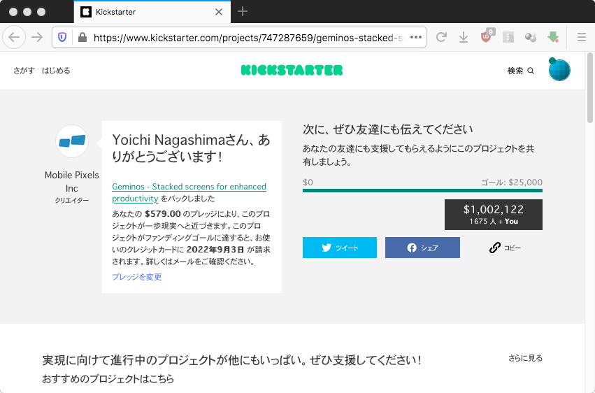 そして今日はいよいよ前期最終日、1限「サウンドデザイン」・2限「音楽情報科学」・4-5限「基礎演習E」の最終合評の日となった。 朝から出てきたテンションで、たまたまネットニュースで流れてきたKickstarterの Geminos - Stacked screens for enhanced productivity(Ergonomic design | Dual 24-inch displays | Built-in 1080P webcam and speakers | USB docking station | 100W USB-C pass-through charging) というのにプレッジ(出資)してしまった。 既に目標金額の40倍になっているので間違いなくゲットできる これ は、上下2段にスタックされた24インチのディスプレイ(+Webカメラ+スピーカ+USBドック+USB-C充電器)というものである。 どんな使い手なのか、ちょっと楽しみだ。