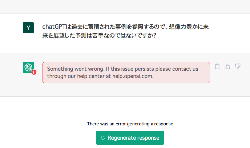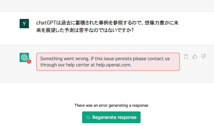ChatGPT関連で こんな情報 も流れてきたが、こんな長いビデオを見る気にはならないのだった。 その後は、20ドルのサブスクが切れてGPT4からGPT3あたりに戻ったChatGPTと、以下のようにおしゃべりを始めてみた。順調に対話が続いている・・・と思っていたら、次の質問「ChatGPTは過去に蓄積された事例を参照するので、想像力豊かに未来を展望した予測は苦手なのではないですか?」では以下のように、どうやらChatGPTの痛いところを突いてしまったのか(^_^;)、返答が止まってエラーとなってしまった。 別に公序良俗に反することも、誹謗中傷も、プライバシー侵害も、何も悪いことはしていないのだが、このあたりにChatGPTの「闇」があるのかもしれない。【質問】 日本ではChatGPTの評判が良くありません。何か解決策はありますか? 【回答】 申し訳ありませんが、私は人工知能であるため、自分自身の評判を管理することはできません。ただし、OpenAIは私を作成した会社であり、その会社は人工知能の倫理的な使用に関する 問題に非常に真剣に取り組んでいます。 もし、ChatGPTが問題を引き起こしていると感じる理由がある場合は、具体的にどのような問題があるか教えていただければ、可能な限りの解決策を提供することができるかもしれません。 【質問】 大学生がChatGPTを使って何も考えずにレポートを完成させていることが問題となっていますが、これについてどう思いますか? 【回答】 ChatGPTが大学生がレポートを完成させるために利用されること自体は問題ではありませんが、それが学術不正行為になることは避けるべきです。大学生は自分で考え、調査し、知識を深める ためにレポート課題を行うことが期待されています。ChatGPTのようなツールは、学生が自分で行うべき作業を代行するだけでなく、学生が自分で学ぶための手段として使われるべきです。 大学側が、学生が学術不正行為を行わないように監視することが重要です。そのためには、明確なルールやガイドラインを設け、違反があった場合には厳格な処分を行うことが必要です。また、 教育プログラムで適切な調査や論文執筆方法を教えることが大切です。それによって、学生がChatGPTのようなツールを正しく活用し、適切な知識やスキルを習得できるようになるでしょう。 【質問】 Google翻訳は全く使えなかったのに対して、DeepL翻訳は非常に優秀でよく活用しています。この両者の差はどこから来たのでしょうか? 【回答】 Google翻訳とDeepL翻訳は、どちらも機械翻訳を提供するための大規模なニューラルネットワークを使用しています。ただし、両者の性能の差は、多くの要因によって引き起こされます。 以下に、その要因のいくつかを挙げてみます。 1. データセットの違い:翻訳の品質には、トレーニングに使用されるデータセットの量と品質が重要な役割を果たします。DeepL翻訳は、トレーニングに使用するデータを厳密に 制御しているため、翻訳品質が向上しています。 2. モデルアーキテクチャの違い:Google翻訳とDeepL翻訳の両方がニューラルネットワークを使用していますが、モデルアーキテクチャの違いが翻訳品質に影響を与えることがあります。 3. 技術的な違い:DeepL翻訳は、AI専門のドイツのスタートアップ企業であるDeepL GmbHによって開発された専用の翻訳エンジンであり、Google翻訳はGoogleが開発した翻訳 エンジンであり、それぞれの企業の技術的なアプローチに違いがあることが考えられます。 総合的に、DeepL翻訳がGoogle翻訳よりも翻訳品質が高いのは、より高品質なトレーニングデータを使用している、より洗練されたモデルアーキテクチャを使用している、そして技術的な 差異があるためと言えます。 【質問】 ChatGPTはWeb版で利用する場合と、API経由で利用する場合とで、回答の質に差があるようですが、何かAPI版を不利にするような作為があるのでしょうか? 【回答】 一般的に、ChatGPTのAPI版とWeb版で提供される回答の質に明確な違いはありません。ただし、API版を利用する場合、APIエンドポイントの選択やリクエストパラメータの設定によって、 回答の質に影響を与えることができます。 また、API版はWeb版よりも柔軟性が高く、より多くのオプションがあります。例えば、API版では、トークンの生成方法や文脈の指定方法、最大生成トークン数などのパラメータを設定できます。 これらの設定が適切に行われない場合、回答の質が低下する可能性があります。 さらに、API版を利用する場合、リクエストを行うアプリケーションの品質や実装方法によって、回答の質が影響を受けることがあります。APIの利用方法について適切な知識を持っていない場合や、 APIの使用方法に対する十分なテストを行っていない場合、回答の質が低下する可能性があります。 以上のように、API版とWeb版で提供される回答の質には、作為的な差異はありませんが、API版の利用方法によって回答の質が影響を受けることがあるため、API版を利用する場合には適切な 設定