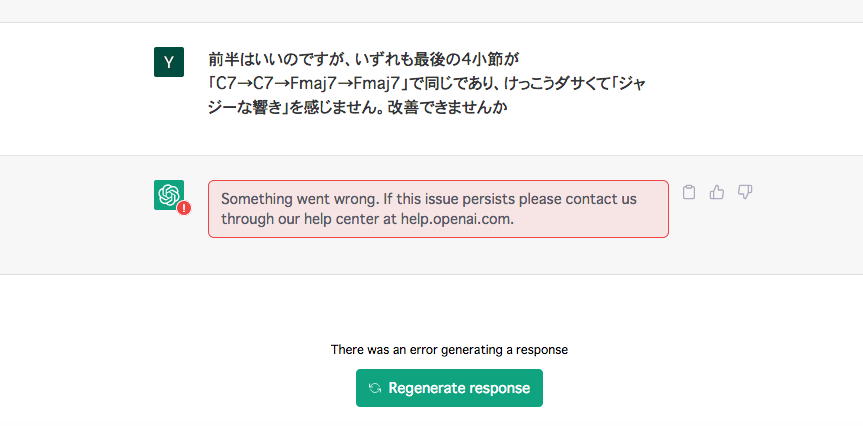 上の提案を受けて、『前半はいいのですが、いずれも最後の4小節が「C7→C7→Fmaj7→Fmaj7」で同じであり、けっこうダサくて「ジャジーな響き」を感じません。改善できませんか』と聞いたところ、遂に上のようにChatGPTがギブアップしたというのか、またエラーとなってストップした。 結局、そこそこ時間を使ってやりとりしたものの、僕がChatGPTから獲得した音楽的知識というのはほぼゼロであり、逆に僕はだいぶChatGPTの音楽的知識の間違いを直してあげたことになる。 これが「ChatGPTは時間喰いの無駄」というやつなのかもしれない。 しかし、「ChatGPTにエラーを出させてSTOPさせる」ゲームという新しいエンタテインメント(これは知力/専門性が必要な「脳トレ」でもある)という可能性を発見できた。