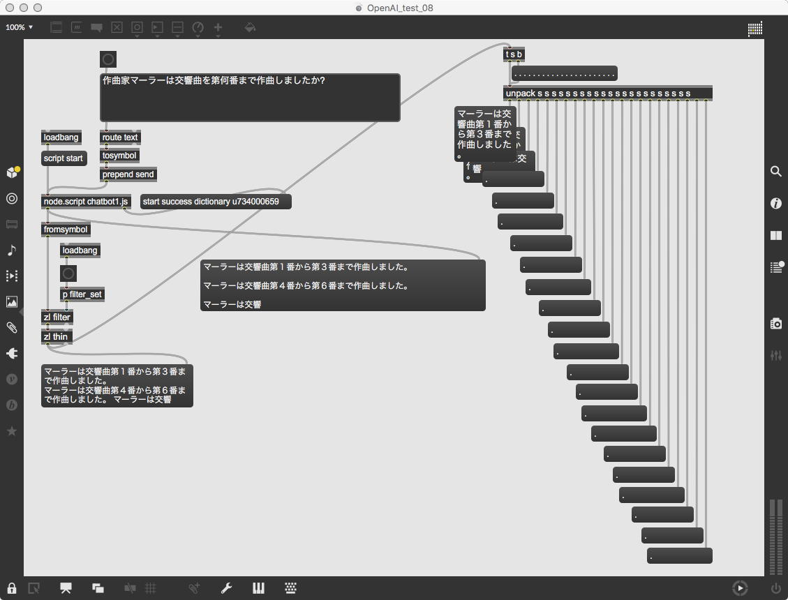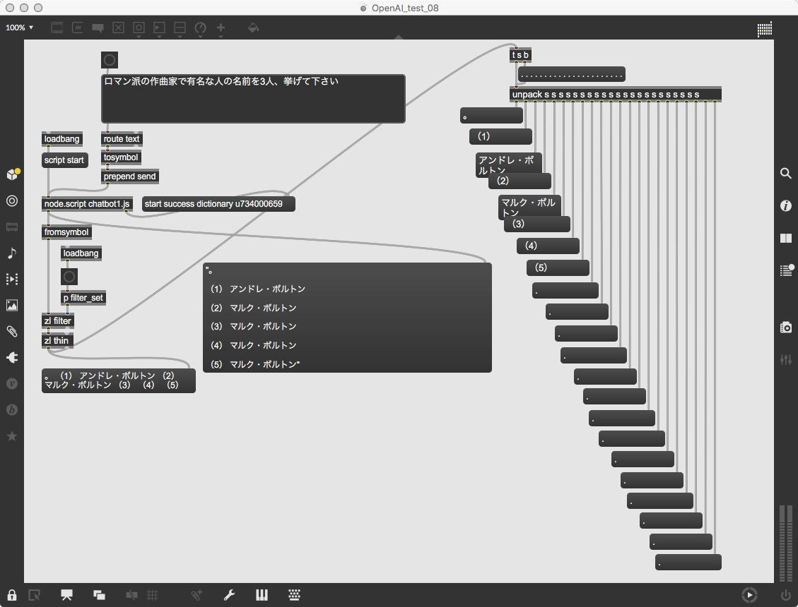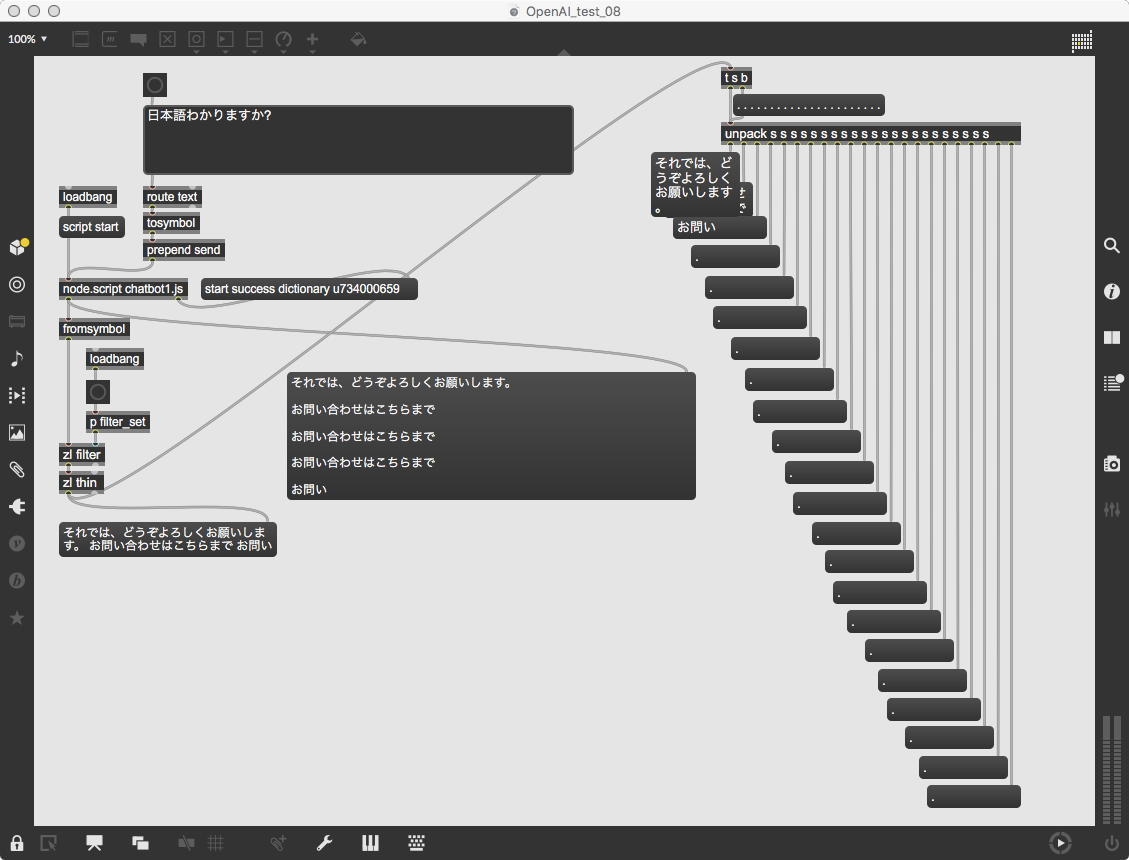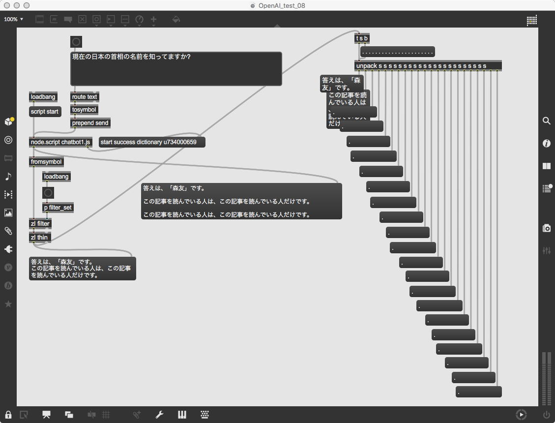 そして、ChatGPT君との このような やりとり(その横ではコンソールで このような 作業も並行)によって、なんとか問題を解決してMax8から何かのメッセージがNode.jsを経由してChatGPTに行き、何かのメッセージがMax8に戻ってくるまでのルートが生み出された。 ただしこの中では、ChatGPT君が気付かずに僕が気付いて解決した、「Node.jsには最初に"script start"というのを入れてあげる必要がある」という、AIが出来ずに人間が突破したポイントがあったのだ・・・と言っておく事にしよう。