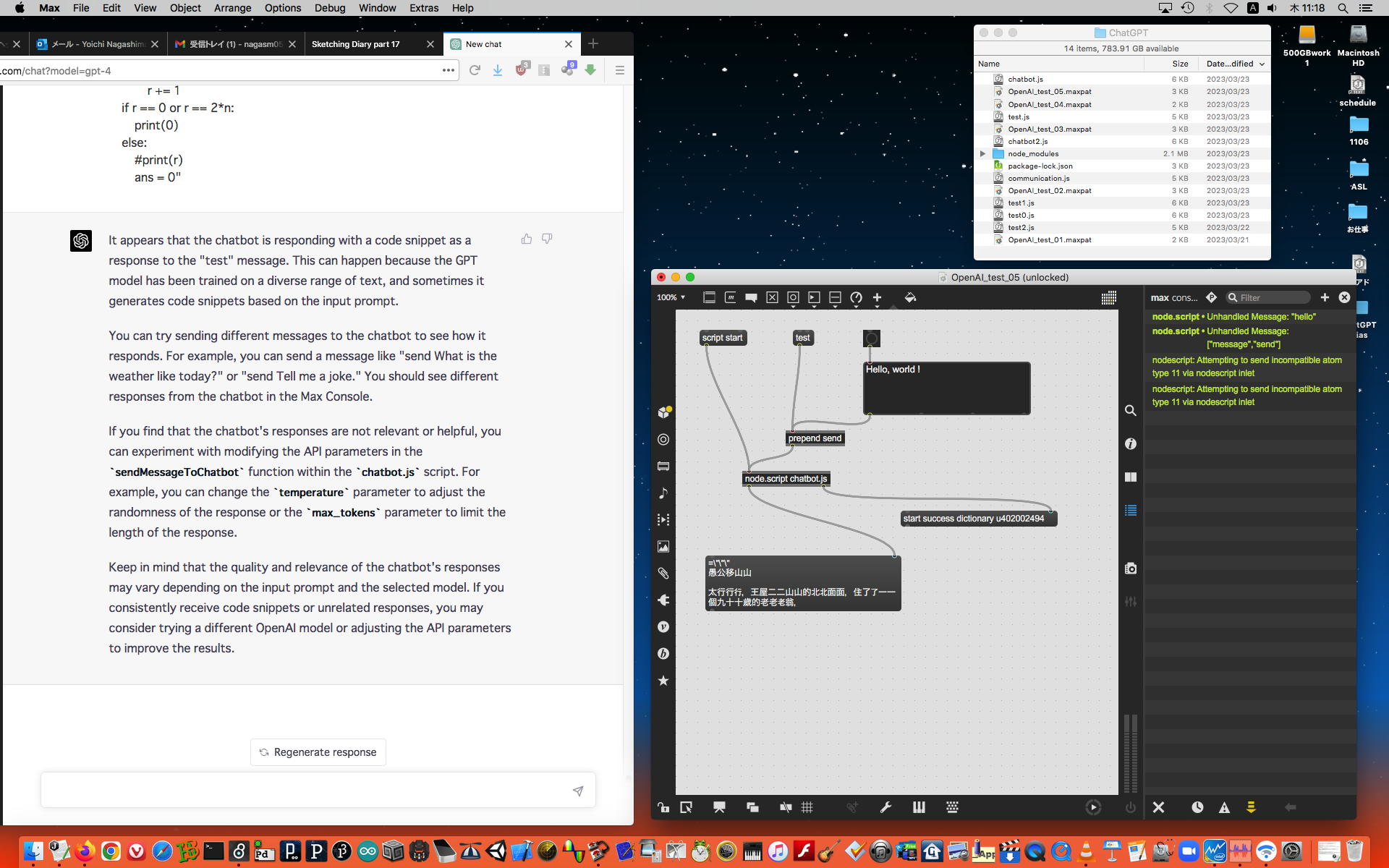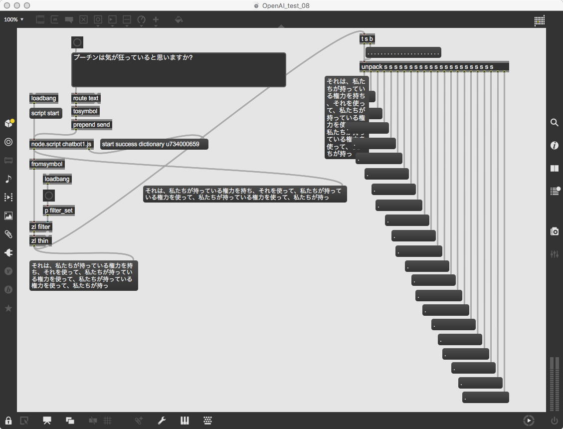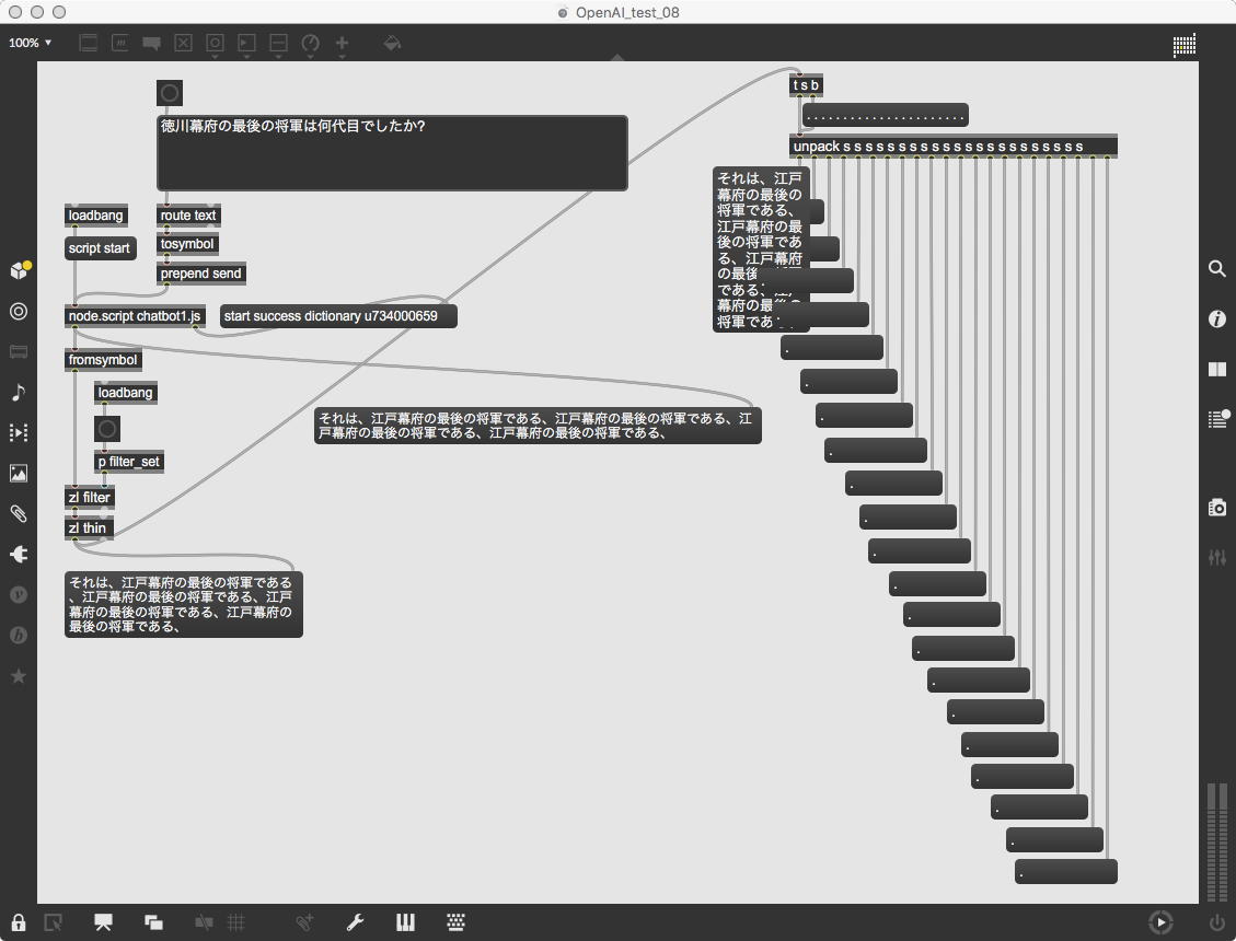 そして、ChatGPT君との このような やりとり(その横ではコンソールで このような 作業も並行)によって、なんとか問題を解決してMax8から何かのメッセージがNode.jsを経由してChatGPTに行き、何かのメッセージがMax8に戻ってくるまでのルートが生み出された。 ただしこの中では、ChatGPT君が気付かずに僕が気付いて解決した、「Node.jsには最初に"script start"というのを入れてあげる必要がある」という、AIが出来ずに人間が突破したポイントがあったのだ・・・と言っておく事にしよう。