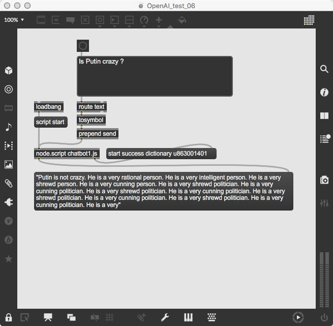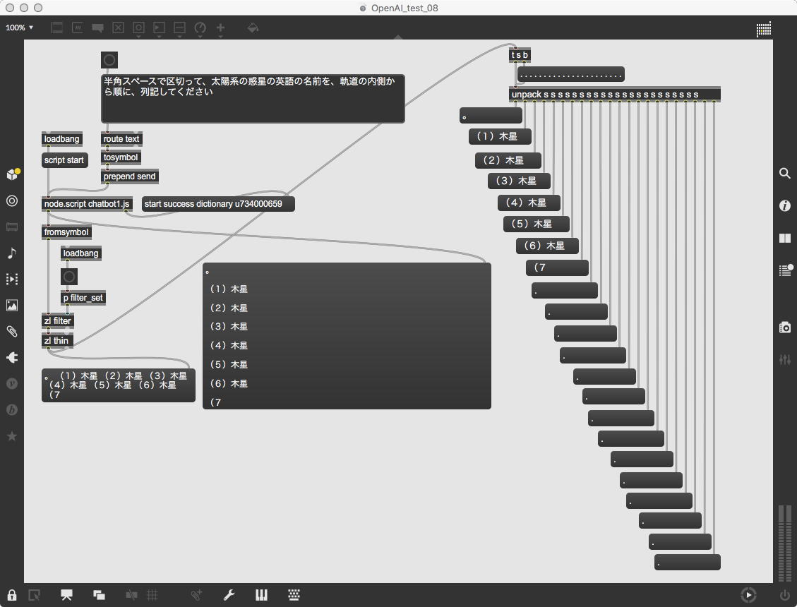 - これで環境設定は完了で、他のマシンで作ったChatGPT用のパッチが開いて、無事にChatGPTと通信できた。ただしAIの回答は以下のようにかなり間違っている模様(^_^;)
