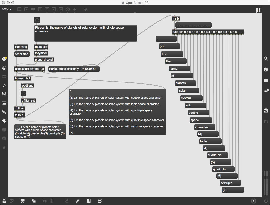 そして、「1+1」と入れたら「"= ''' The Zen of Python, by Tim Peters Beautiful is better than ugly. Explicit is better than implicit. Simple is better than complex. Complex is better than complicated. Flat is better than nested. Sparse is better than dense. Readability counts. Special cases aren't special enough to break the rules. Although practicality beats purity. Errors should never pass silently. Unless explicitly silenced. In the"」と返ってくるとか、 「hey」と入れたら「"','hey','hey','hey','hey','hey','hey','hey','hey','hey','hey','hey','hey','hey','hey','hey','hey','hey','hey','hey', 'hey','hey','hey','hey','hey','hey','hey','hey','hey','hey','hey','hey','hey','hey','hey','hey','hey','hey','hey','hey','hey','hey'] # *** # Simple string functions # <"」と返ってくるとか、の実験がスタートした。 重要なのは、ブラウザ上でのchatでなく、Max8からやっているところなのだ。