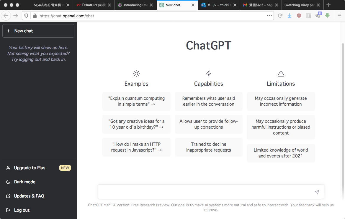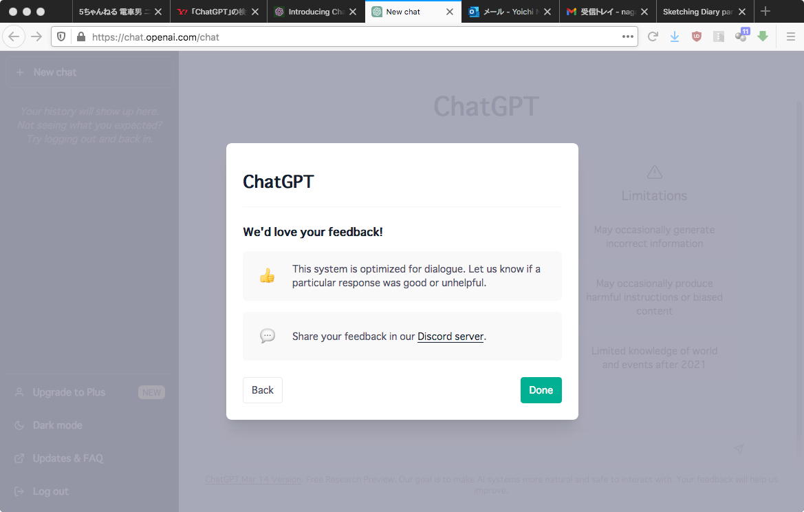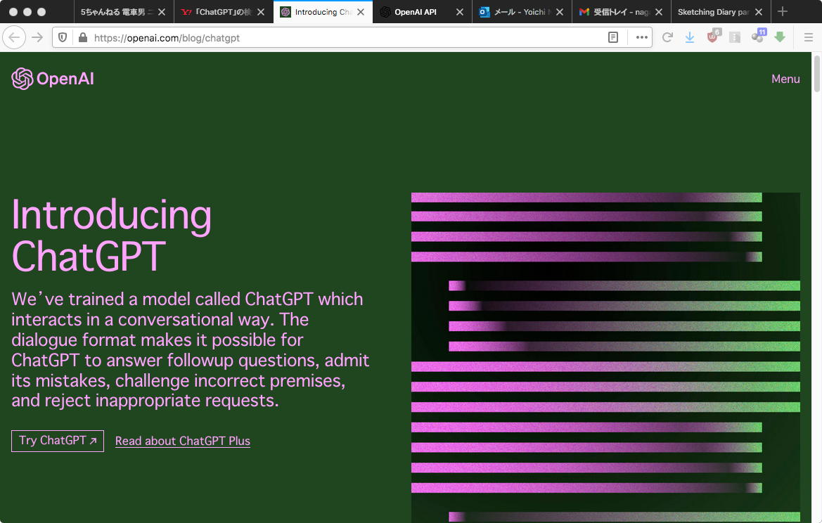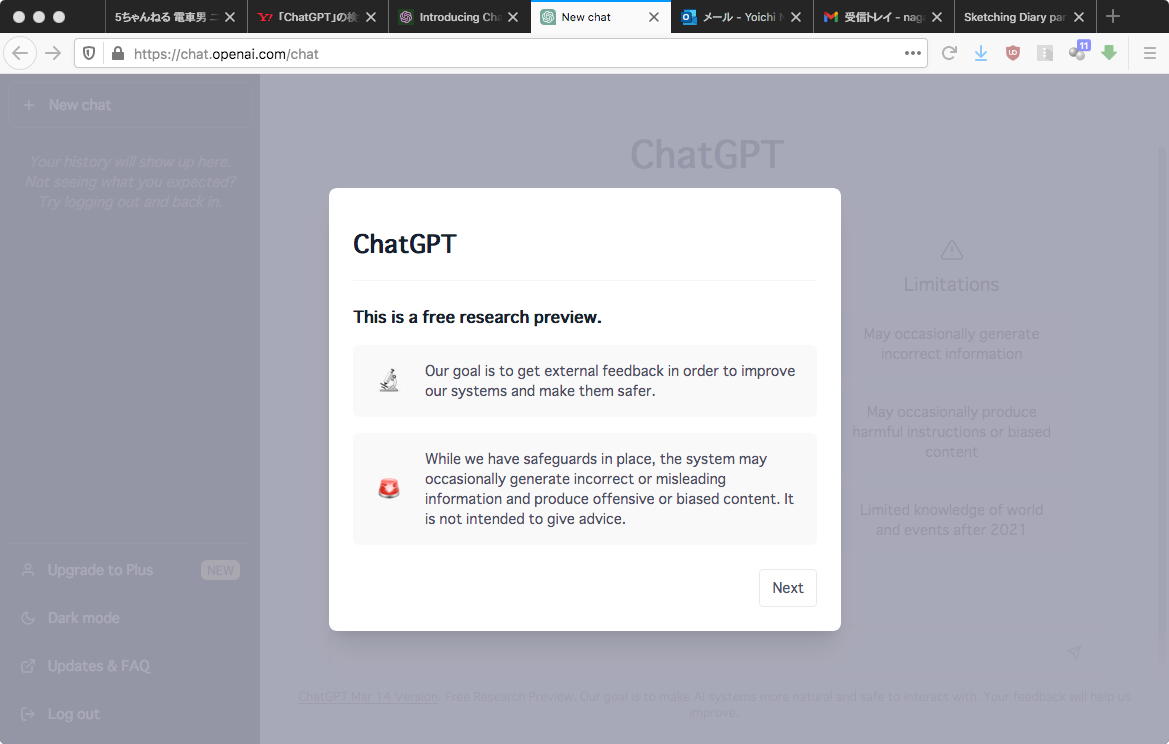 昨日までの4日間、3年ぶりに 25回目の沖縄 に行ってきた。 電車やフライトではほぼ皆んながマスクをしているが、国際通りなど街では僕もノーマスクとなり、ようやく眼鏡をかけて歩けるという通常の生活に戻ってきた。 その沖縄で、琉球大の河野先生が「ChatGPTは面白い」とやたら力説するので、これまで(半分敢えて)ノータッチだったのだが、AI体験してみることにした。 まずは「ChatGPT」で検索して出てきた、以下の Introducing ChatGPT - OpenAI というページに行ってみた。
