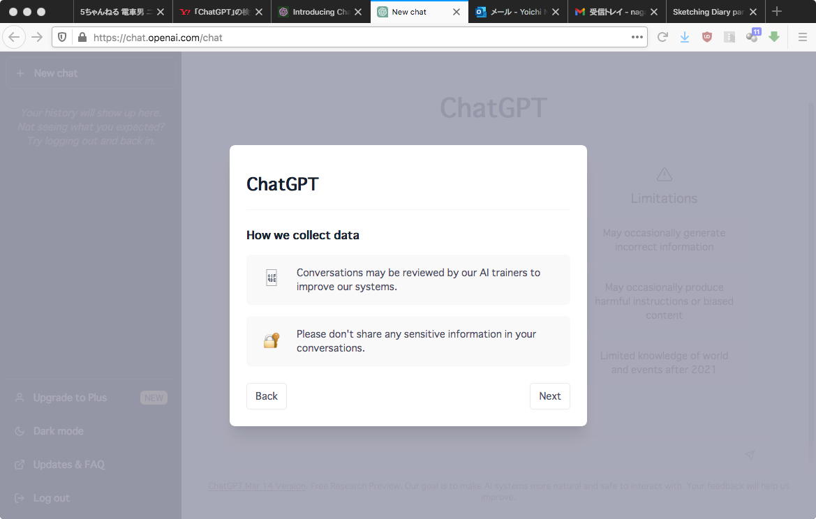 そして、このページの左下にあった「Try ChatGPT」というボタンから携帯電話での認証によってアカウントを登録すると、以下のようにずんずん進んで行って、もうChatGPTのページに到達してしまった。