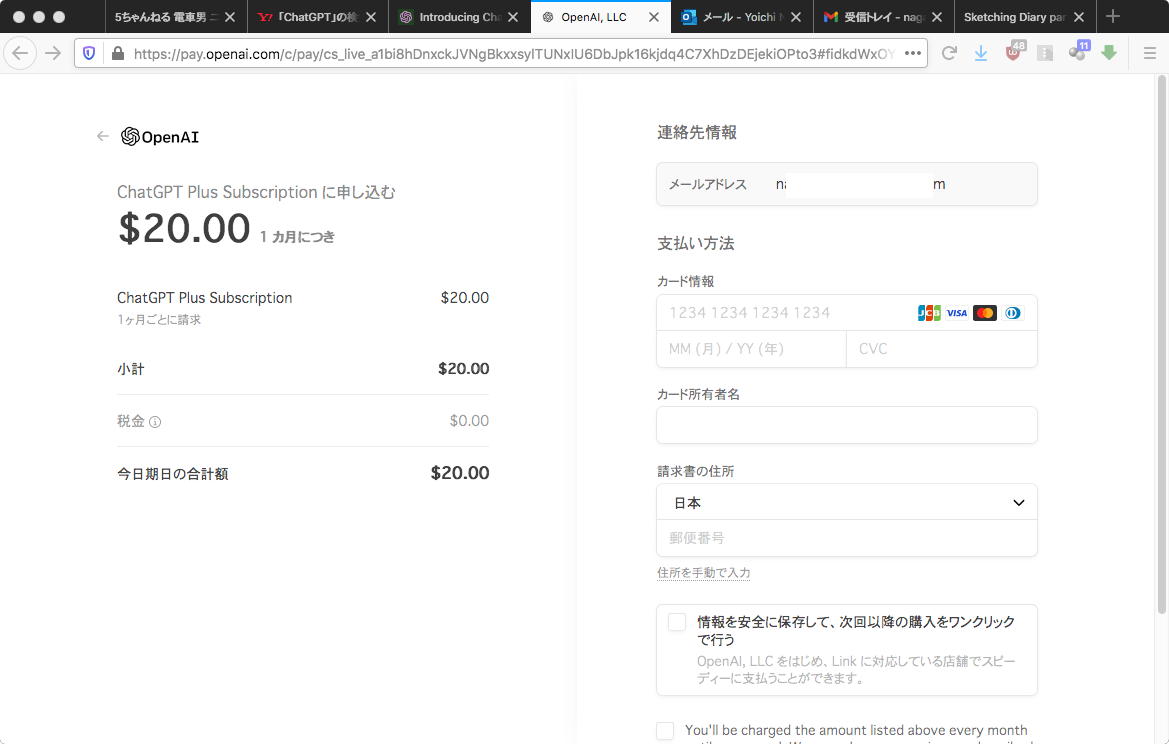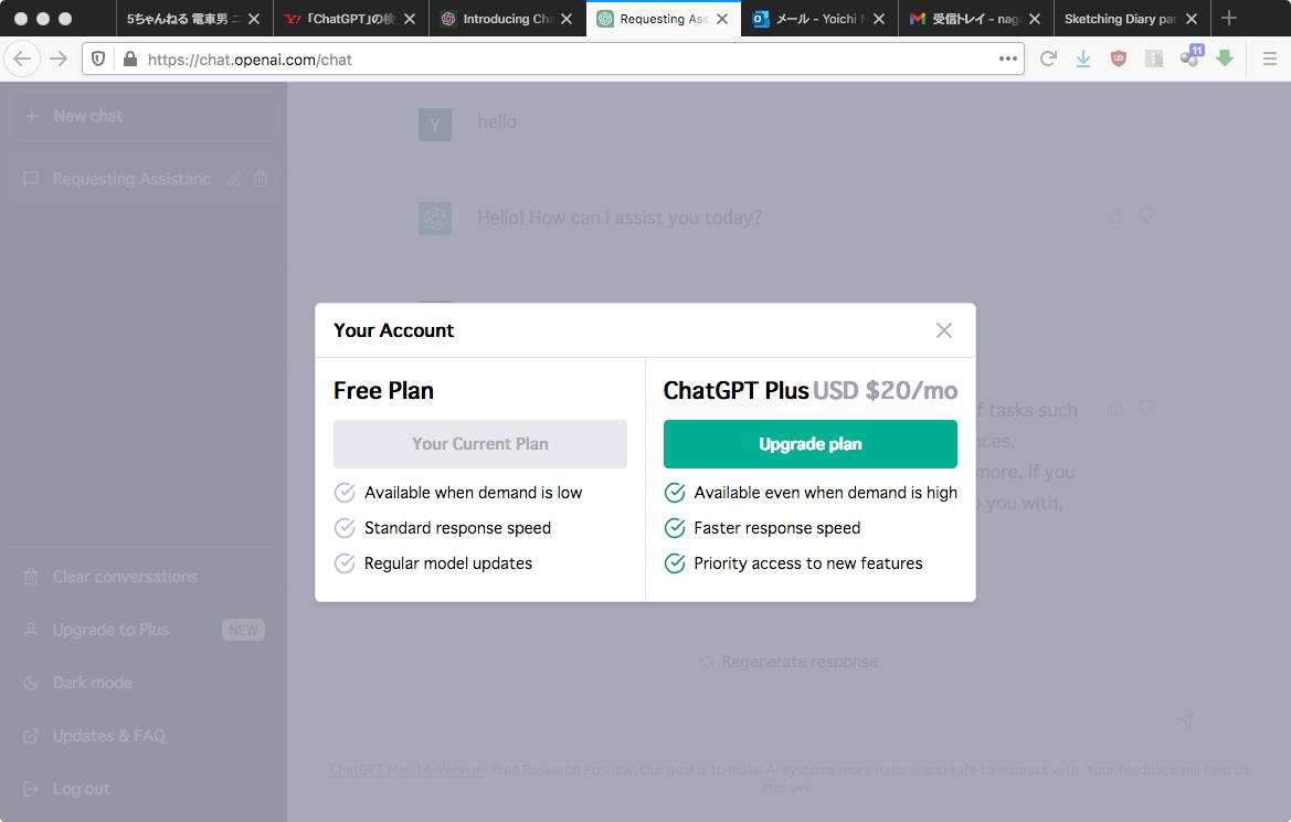 そしてここで気付いたのは、左のタブにあった「Upgrade to Plus」というボタンである。 河野先生によれば、この無料版のChatGPTに比べて、最近になって出てきたという「GPT-4」というレベルに有料登録すべきである・・・とのことだったので、以下のようにずんずん進んでクレジット(月額20ドル)支払いを登録して、「Model: GPT-4」というところに行き着いた。 なんとGPT-4は1週間前の今月14日にリリースされたのだった。