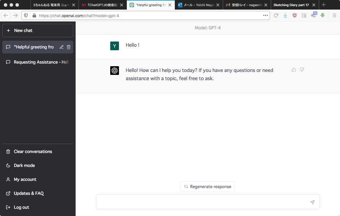 ここで昼食などが挟まったが、なんせ相手は人間ではないので、このチャット画面はブラウザのタブの一つとしてそのまま放置でいいのだ。 そして、「ChatGPT」を検索した中にあった ChatGPTと違う?「GPT-4」使ってみたリアルな感想 とか、 ChatGPT(Wikipedia) (この中の「肯定的な意見」・「否定的な意見」・「学界」の項目は必読)とか、 AIプロ集団から見た「ChatGPTの歴史」 たった5年で何が起こったのか とか、 ChatGPT(チャットGPT)とは とか、 ChatGPTとは?始め方と使い方を徹底解説 とか、 さらに進化したChatGPTの最新「GPT-4」について知っておくべきこと とか、 ChatGPTを支える技術が“複製”され、会話型AIの能力が解き放たれる時代がやってくる とかのページをざっと眺めてみた。