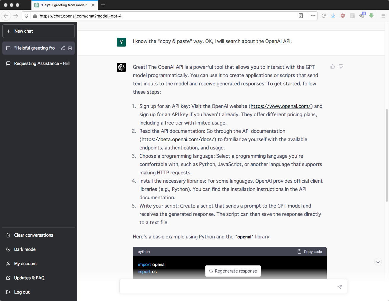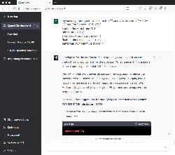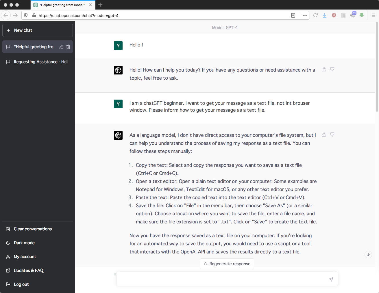 そして、実質的にはここからが本番の「AI体験」なのだが、まずは「あなたのレスポンスをブラウザ画面の表示でなくテキストファイルで欲しい」とやってみた。 これは今後の実験(ちょっとしたアイデアを思い付いた)に繋がるための情報のテストである。 すると、だらだら・・・と出てきたのは、「ブラウザ内のメッセージをコピーして、テキストエディタを開いて、そこにペーストして保存せよ」という回答だった(^_^;)。 さらにヒントとしてOpenAI APIを使うことも出来る、と添えていた。