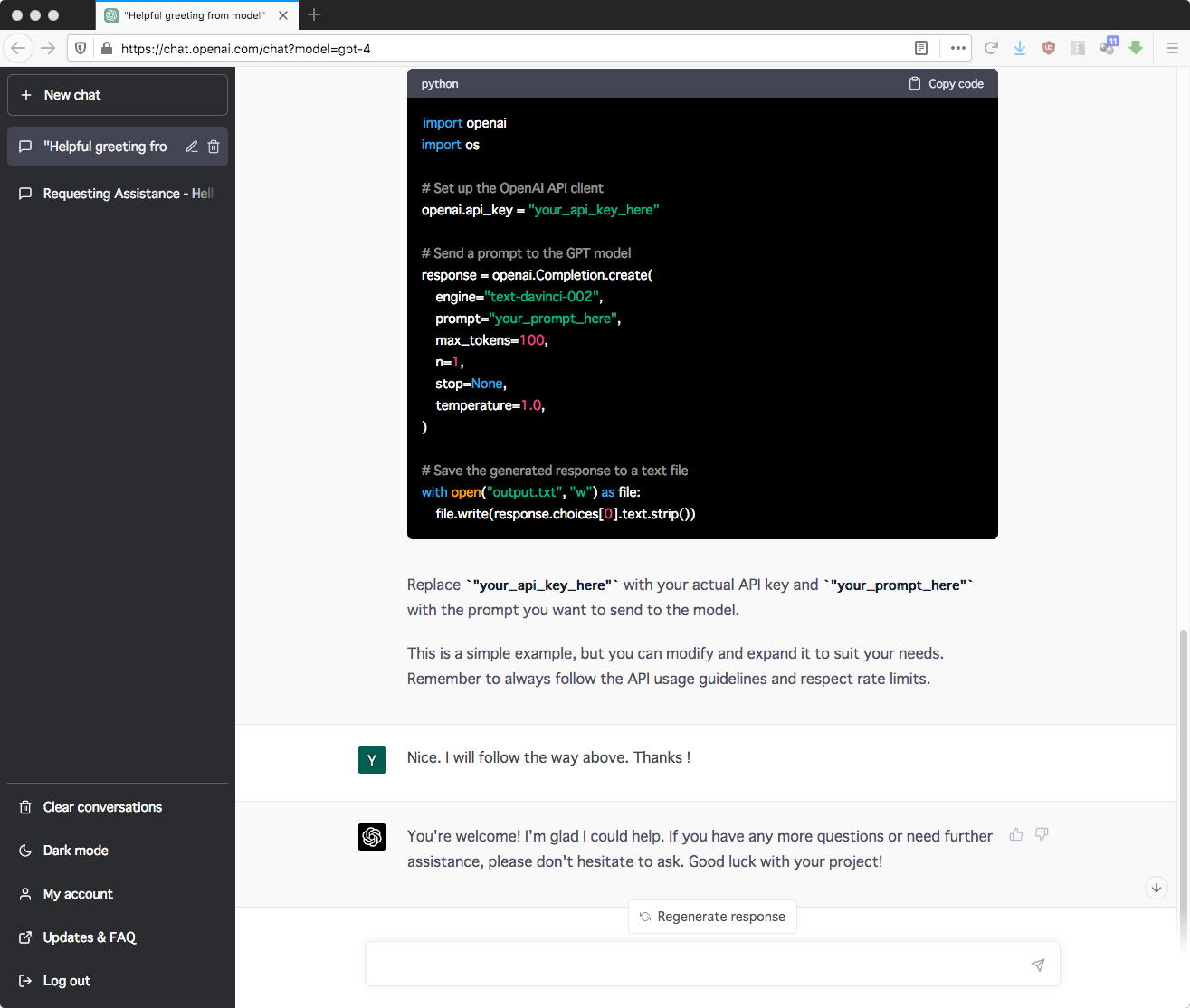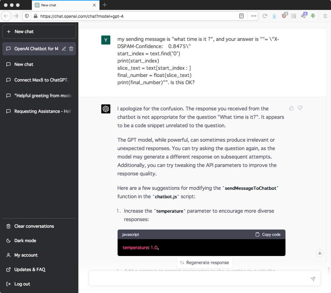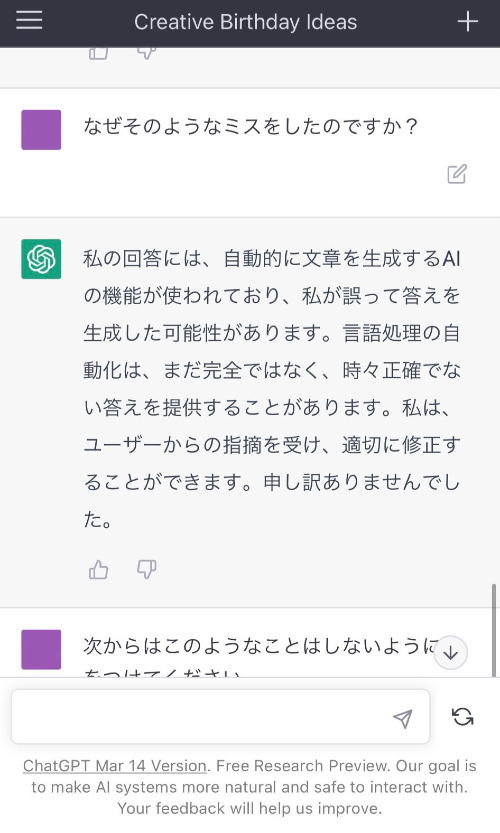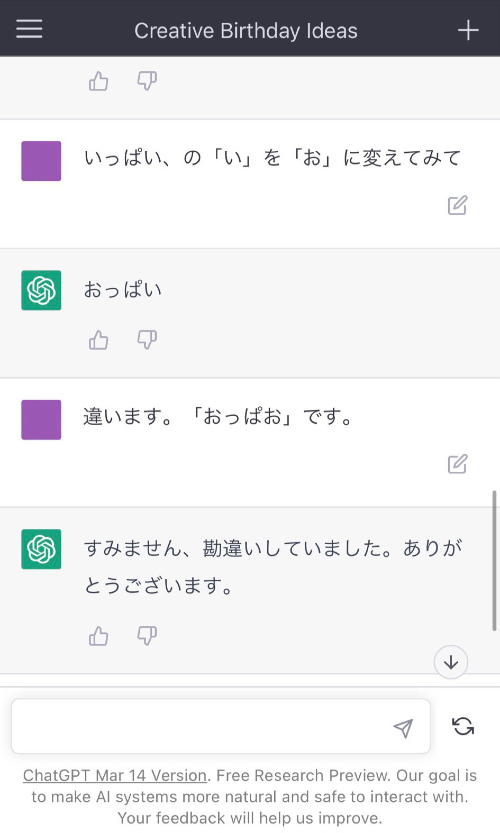 そして、「what time is it ?」と入れたら 「"= \"X-DSPAM-Confidence: 0.8475\" start_index = text.find('0') print(start_index) slice_text = text[start_index : ] final_number = float(slice_text) print(final_number)"」と返ってきたのだがこれでOKなの? と質問してみると、上のようにDeepL翻訳によれば「混乱を招いたことをお詫びします。チャットボットから受け取った応答は、"今何時ですか"という質問には適切ではありません。質問とは関係のないコードスニペットのようです」「GPTモデルは強力ですが、時には無関係な回答や予期せぬ回答を出すことがあります。そのような場合は、再度質問してみるとよいでしょう。さらに、APIパラメータを微調整して、レスポンスの質を向上させることもできます」「チャットボットの応答の品質と関連性は、入力プロンプトと選択したモデルによって異なる可能性があることに留意してください。より良い結果を得るために、異なるプロンプト、APIパラメータ、あるいはOpenAIのモデルで実験を続けることができます」「お役に立てれば幸いです!何かご質問やご不明な点がございましたら、ご連絡ください」という優等生的な、しかしあまり役に立たない返答が返ってきた。 まぁ、現状のAIというのはこういうものなのかもしれないが、まだまだ実験を進めていくことにした。