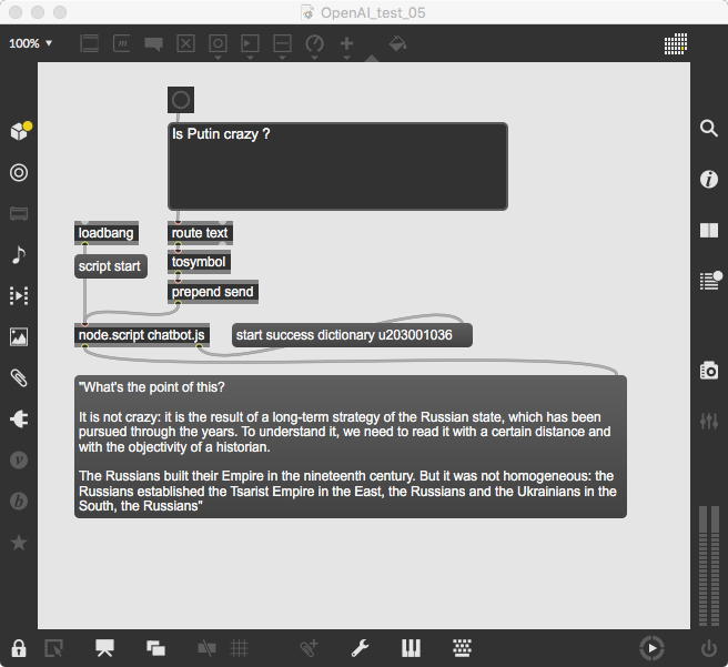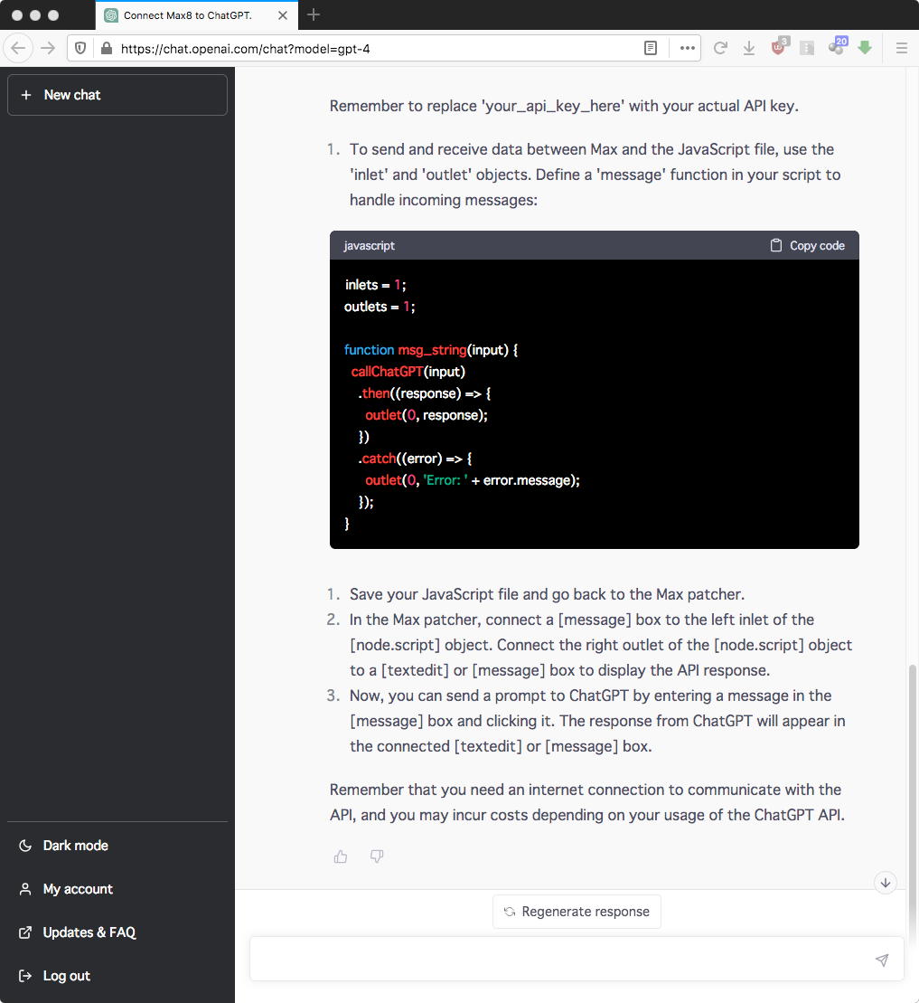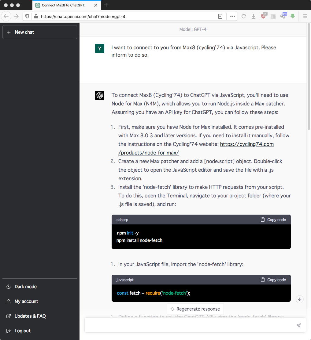 昨日は記念すべき「ChatGPT初日」だったが、沖縄旅行の疲れが出て夜7時には就寝して寝ていた間にあれこれ「夢か現か」状態のアイデアが浮かんできて、「Max8からだとGENにもJavascriptのサンプルがあった」とか思い出してきた。 ところが、今日になって(今日は昼過ぎに帰宅してJoyJoyなのでろくに時間が取れない)、とりあえず「I want to connect to you from Max8 (cycling'74) via Javascript. Please inform to do so」と入れてみると、以下のようにズラズラと、試行錯誤してみたかった道のりが教示されてしまった。 なるほど、これは確かに「AIは便利」であるものの、「AIは人間を馬鹿に退化させる」ものでもある・・・と理解できた。