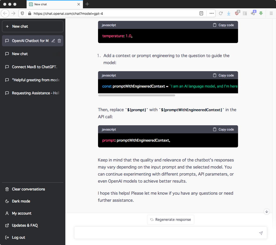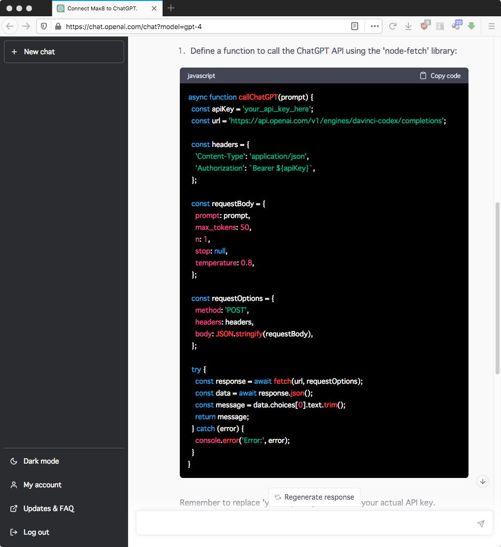 そこで、そのOpenAI APIについて質問すると、以下のように「API Keyをゲットする」(さらに別途料金が必要かも・・・)、などと指示があって、Pythonのサンプルコードまで出てきた。 これは素晴らしいが、僕が欲しいのは、Max8でOpenAI(GPT-4)を使うことなのである。 これはもしかするとMaxコミュニティで質問するといいのかもしれないが、出てきたばかりのGPT-4はちょっと無理っぽいし、このままここで質問しても出てくるような気もしてきた。