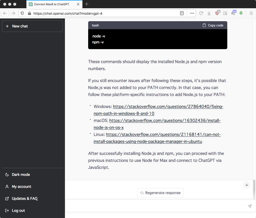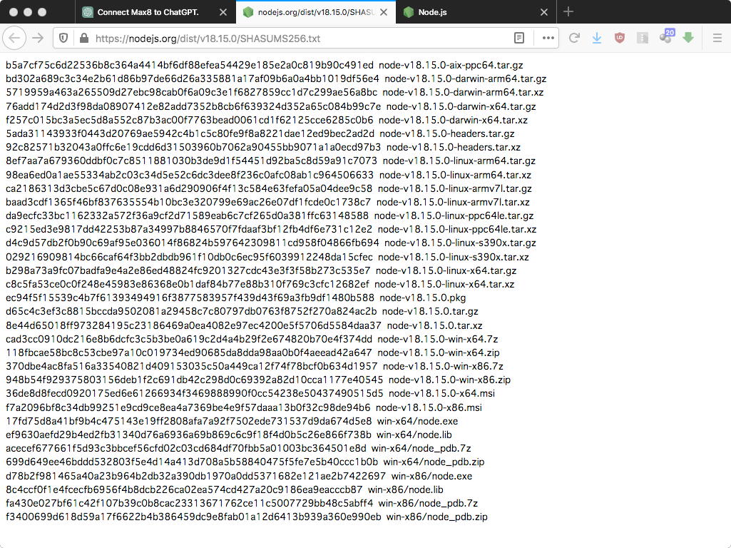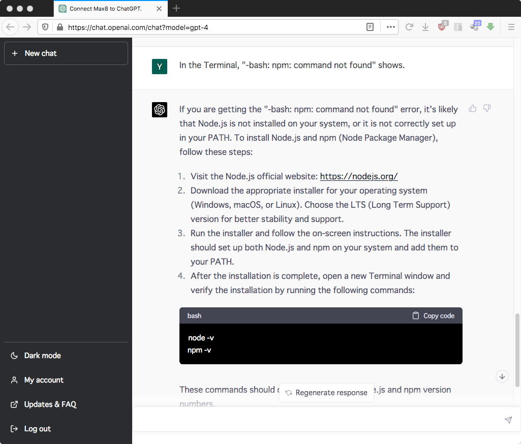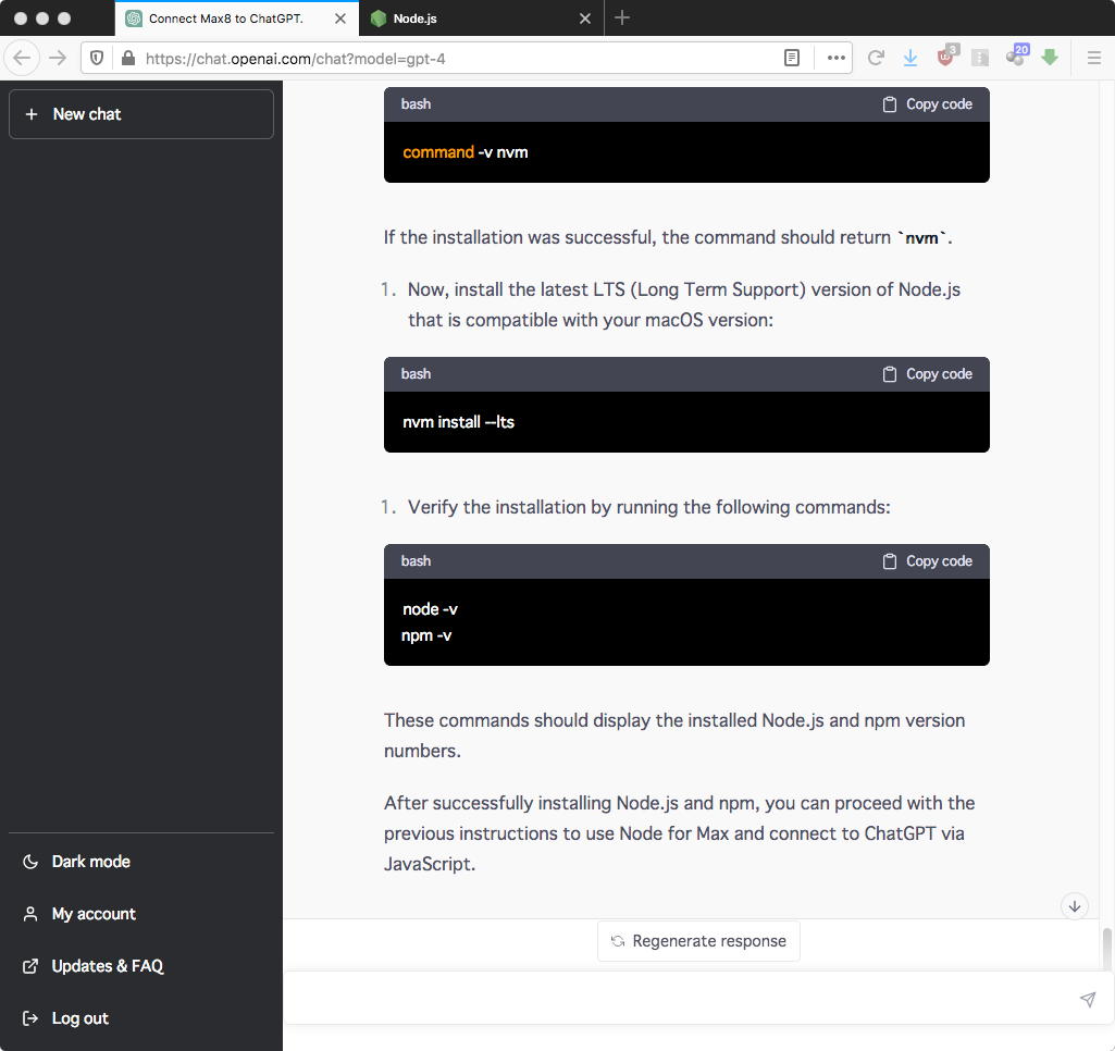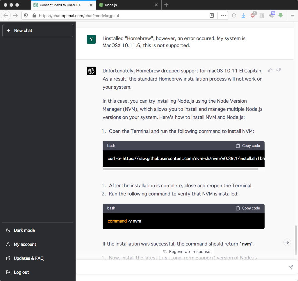 この後もあれこれ寄り道したのだが、要するにどれだけ回り道してもChatGPT君はクサることなく解決方法をどこからか拾ってきて提示してくれて、「latest LTS (Long Term Support) version of Node.js」のインストールに成功した。 そして結局、僕の古風なMacでも以下のようにNode.jsのインストールが完了して、元のステップに戻って進められることになった。nagasm-Mac-mini-2:Desktop nagasm$ curl -o- https://raw.githubusercontent.com/nvm-sh/nvm/v0.39.1/install.sh | bash % Total % Received % Xferd Average Speed Time Time Time Current Dload Upload Total Spent Left Speed 100 15037 100 15037 0 0 135k 0 --:--:-- --:--:-- --:--:-- 135k => Downloading nvm from git to '/Users/nagasm/.nvm' => Cloning into '/Users/nagasm/.nvm'... remote: Enumerating objects: 358, done. remote: Counting objects: 100% (358/358), done. remote: Compressing objects: 100% (304/304), done. remote: Total 358 (delta 40), reused 166 (delta 28), pack-reused 0 Receiving objects: 100% (358/358), 219.04 KiB | 343.00 KiB/s, done. Resolving deltas: 100% (40/40), done. * (HEAD detached at FETCH_HEAD) master => Compressing and cleaning up git repository => Appending nvm source string to /Users/nagasm/.bashrc => Appending bash_completion source string to /Users/nagasm/.bashrc => Close and reopen your terminal to start using nvm or run the following to use it now: export NVM_DIR="$HOME/.nvm" [ -s "$NVM_DIR/nvm.sh" ] && \. "$NVM_DIR/nvm.sh" # This loads nvm [ -s "$NVM_DIR/bash_completion" ] && \. "$NVM_DIR/bash_completion" # This loads nvm bash_completion nagasm-Mac-mini-2:Desktop nagasm$そして、なんだかあと少しでいけそうなところまで進んだが、残念ながらここで今日は時間切れとなった。 なかなかChatGPT君は頼もしい奴だ・・・という気もしてきたが、まだまだ先は見えない。 明日以降に実験を進めてみることにしよう。nagasm-Mac-mini-2:~ nagasm$ command -v nvm nvm nagasm-Mac-mini-2:~ nagasm$ nvm install --lts Installing latest LTS version. Downloading and installing node v18.15.0... Downloading https://nodejs.org/dist/v18.15.0/node-v18.15.0-darwin-x64.tar.xz... ######################################################################## 100.0% Computing checksum with shasum -a 256 Checksums matched! Now using node v18.15.0 (npm v) Creating default alias: default -> lts/* (-> v18.15.0) nagasm-Mac-mini-2:~ nagasm$ node -v dyld: lazy symbol binding failed: Symbol not found: ____chkstk_darwin Referenced from: /Users/nagasm/.nvm/versions/node/v18.15.0/bin/node Expected in: /usr/lib/libSystem.B.dylib dyld: Symbol not found: ____chkstk_darwin Referenced from: /Users/nagasm/.nvm/versions/node/v18.15.0/bin/node Expected in: /usr/lib/libSystem.B.dylib Trace/BPT trap: 5 nagasm-Mac-mini-2:~ nagasm$ npm -v dyld: lazy symbol binding failed: Symbol not found: ____chkstk_darwin Referenced from: /Users/nagasm/.nvm/versions/node/v18.15.0/bin/node Expected in: /usr/lib/libSystem.B.dylib dyld: Symbol not found: ____chkstk_darwin Referenced from: /Users/nagasm/.nvm/versions/node/v18.15.0/bin/node Expected in: /usr/lib/libSystem.B.dylib Trace/BPT trap: 5 nagasm-Mac-mini-2:~ nagasm$