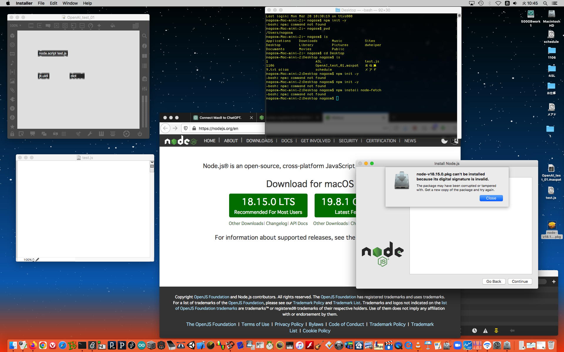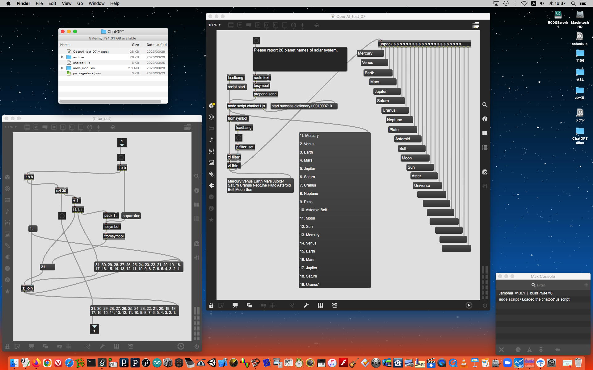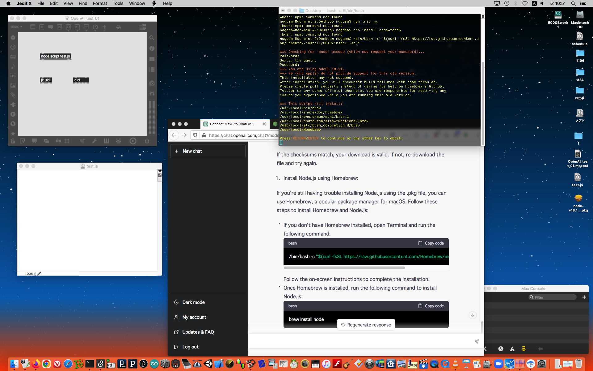 そして次の作業として、ChatGPT4によってここまで僕のMac(10.11.6)で環境設定できた一連の作業を、他のMacにも実装するために、過去のログ(自動で保存される)を発掘して、研究室MacBookAirで試しながら、上のようにまとめてみた。 これはあくまで最新のMac環境でなく、「OSX 10.11.6のMax8 8.3.3でOpenAIのAPIとやりとりするためのもの」に限定されている事に注意されたい。 他の環境やバージョンの場合には、使うツールが全く異なるのだが、問題がある場合のエラーメッセージ等を伝えると、ChatGPT君は別のツールを探してくれてなんとかするのだが、このあたりが従来の「人間ノウハウ」では限界があり、さらに何度リトライしてもChatGPT君は疲れを知らない(諦めないし腐らない)のが最大の強みなのだった。