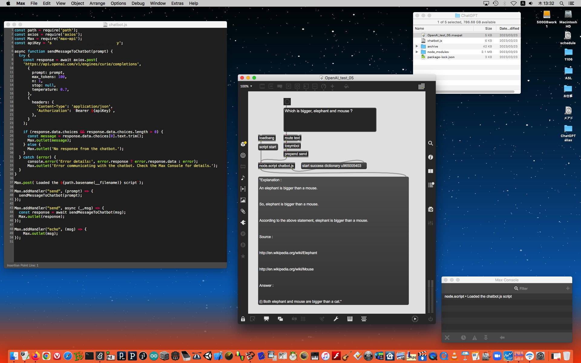 その後、上のトラブルを解決するためにあれこれChatGPT君と一緒に試行錯誤して、さらに最後にはまたまた僕がMaxユーザの経験からChatGPT君の知らなかった手法を駆使して、無事に上のように、ちゃんと「Max8からChatGPTとやりとりする」というシステム(そのために必要なNode.jsのためのスクリプト)を完成させた。 僕からのメッセージは「OK, I understand the situation. I am using the textedit object, but this object automatically add "text" at the top of the message. Then I add "route text" object to cut the top "text" word. Then next I add "tosymbol" object and finally "prepend send", then connect the "node.script chatbot.js". Then the output is ferfect! Compared with, I will use "curie", not "davinci".」であり、これに対してChatGPT君のリプライが「I'm glad to hear that the solution worked for you, and you're now receiving appropriate responses from the chatbot! Using the route text, tosymbol, and prepend send objects in sequence is a good way to handle the message formatting before sending it to the node.script object. Switching to the "curie" model is a good choice for general conversation purposes, as it can provide relevant responses at a lower cost compared to the "davinci" model.」である。 しかし上の画面を良く見て欲しいのだが、「象と鼠はどちらが大きい?」と聞いたのに、あれこれご託を並べて、最後の結論は「象も鼠も猫よりは大きい」である。 さすがの最先端AIなのだった(^_^;)。 その後、またSUACネットが断続的に途切れたので、仕方なく3時過ぎに帰宅した。やれやれである。