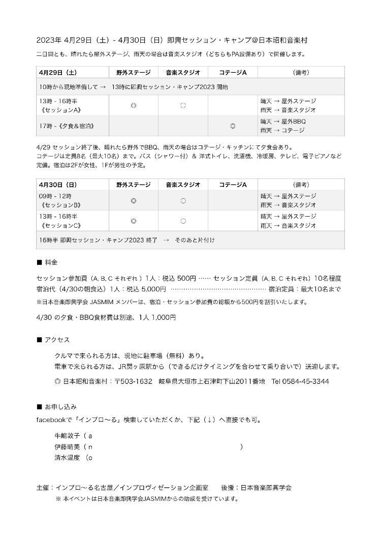 一昨日と昨日は 即興セッションキャンプ2023 に参加して、久しぶりに完全アドリブ(打ち合わせナシの即興だけで演奏とか舞踏)セッションの楽しみを満喫した。 夜に高速道路を帰ってくるのは避けたいのでいつものように大垣で後泊して、晩には「カラオケ喫茶ぽぷら」というのを発見して、1曲100円10枚綴りのカラオケ券を2冊(計20曲)完走した。 以下はその4月の成果であり、3月の記録はこの日記の「2023年4月3日(月)」のところにあり、その前の2月と1月の記録はこの日記の「2023年2月28日(火)」のところにあり、それ以前の記録は同じこの日記の「2023年1月5日(木)」、「2022年10月30日(日)」などにある。今日からもう5月ということで、僕のSUACカウントダウンは12分の1が過ぎ去ったことになった。 そして今日は、6月末の日本時間学会大会の タイムテーブル が届いた。 全体で12件というのはなかなか集まったようだが、2日目の日曜日はお昼まででオシマイ、おそらくこの午後(というかランチ)から、世界時間学会の方の企画がスタートするのだろうが、僕は山口大学から湯田温泉駅まで歩いて、夕方にはSUACに帰着する予定となった。