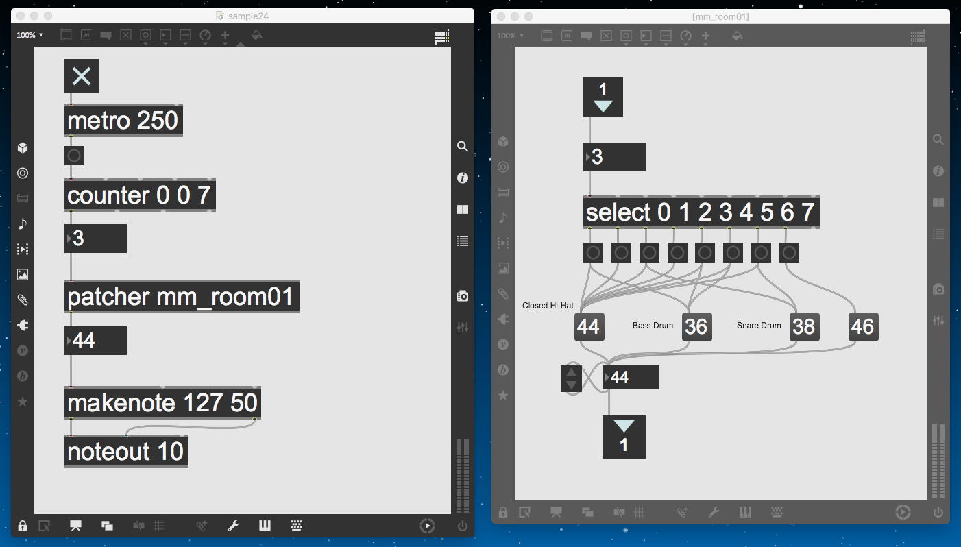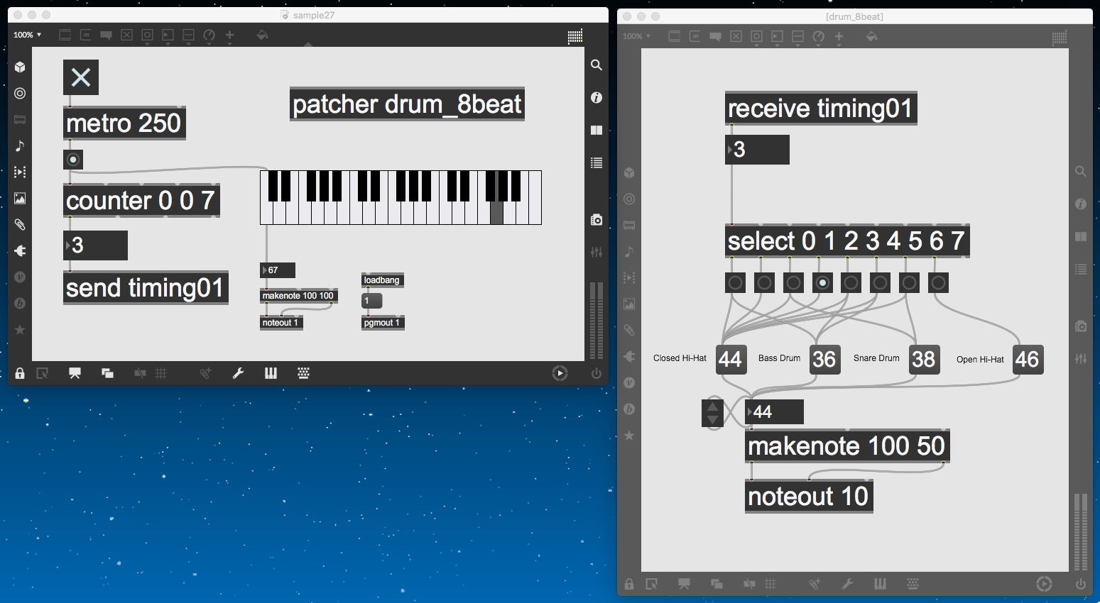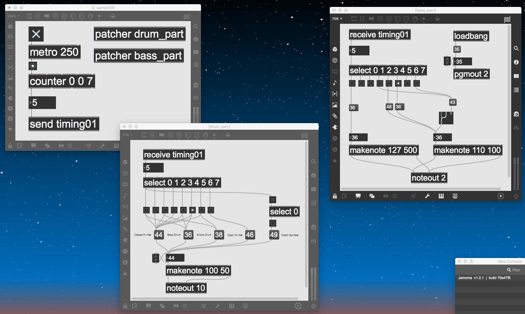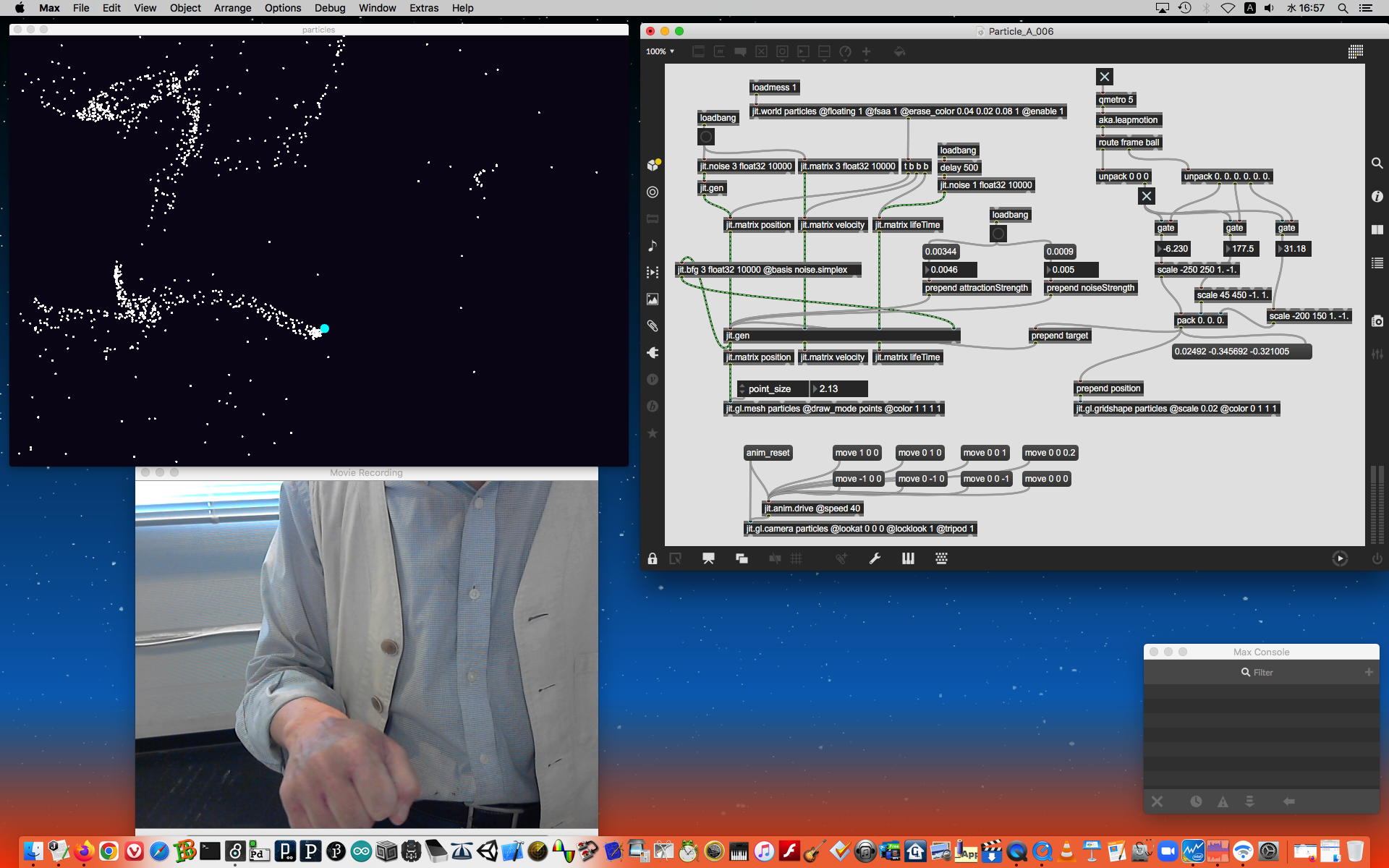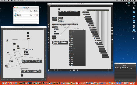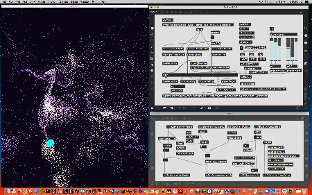 そして苦闘3時間、夕方には上のように、Leapmotionで3次元空間を動かす「手」の場所に対応したところをPartialsの湧出点として追従させて、そこからjitter+GenによるPartialsがわらわらと出てくる・・・というところまでMaxパッチを進めることが出来た。 これは王さんにとっても、ライヴパフォーマンスに反応してPartial系のライヴ・グラフィクスを生成させるために役立つと期待できそうだ。 YouTube動画は これ である。 ちなみにこのスクリーンショット/YouTube動画のMaxパッチでは、Webカメラで向かいから僕の手元を撮っていて、左右方向と奥行き方向が逆になるために、本来のMaxパッチから臨時にscaleのパラメータ設定を反転させているので注意されたい。 明日にもう少し実験してみることにしたものの、とりあえずこれで安心して帰宅できることになった。 やっぱり、Maxプログラミングというのは、楽しいのだ。(^_^)