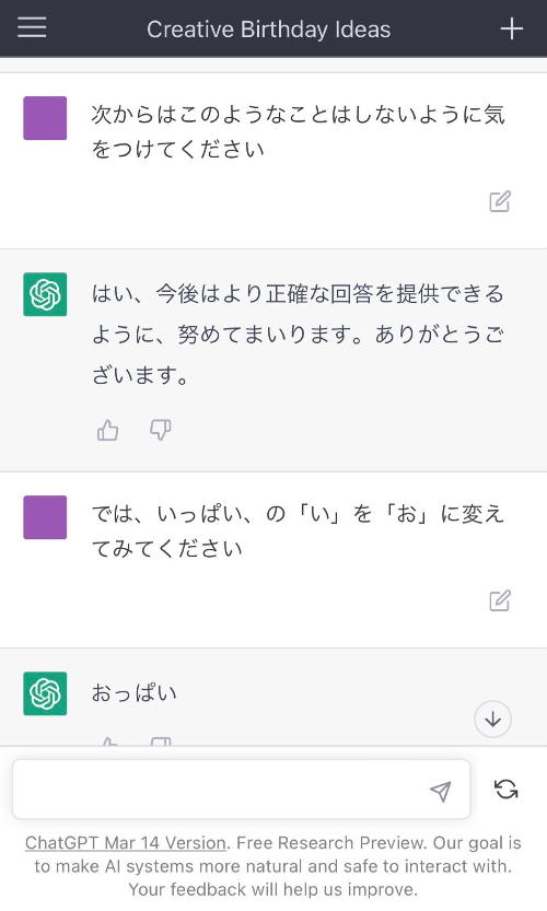 - 多くの場合、API経由の質問の文章そのままを返答として返すという非人間的な対応