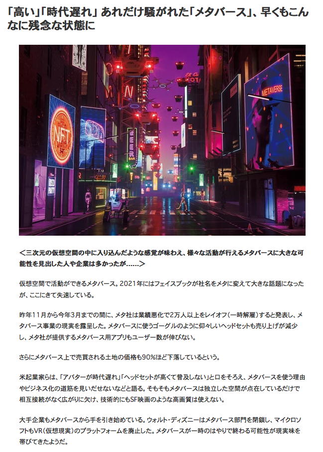昨日の名人戦第2局は今朝の新聞を見ると「藤井聡太竜王、名人戦開幕2連勝 非常に難解な将棋を制す」とのことだった。 棋譜を追いかける余裕もなく、朝の研究室で出張に出掛ける準備である。 ネットニュースでは、「高い」「時代遅れ」 あれだけ騒がれた「メタバース」、早くもこんなに残念な状態にという上のような記事が紹介されていたが、メタバースに未来が無いというのは僕は最初から予想していた。 去年のOMMFでは出展参加者はメタバースへの参加が推奨され、2次元の簡易版GatherTownには参加を義務付けられたので仕方なく参加したが、これがダメダメだったのは去年から明らかだった。 現在でもある企業は「当社はメタバースに出ています」とテレビCMを続けているが、あんなスカスカな空間で何もブツが無くて、動けば激重でネットの負荷(課金)ばかり消耗するというのでは、誰が喜んで参加する筈もない、と看破していた。 大体、両目の視力のアンバランスでHMDが無理な僕にとって、「3Dテレビ」・「VRもの」などと同様に、メタバースは論外/興味外のものなのだ。