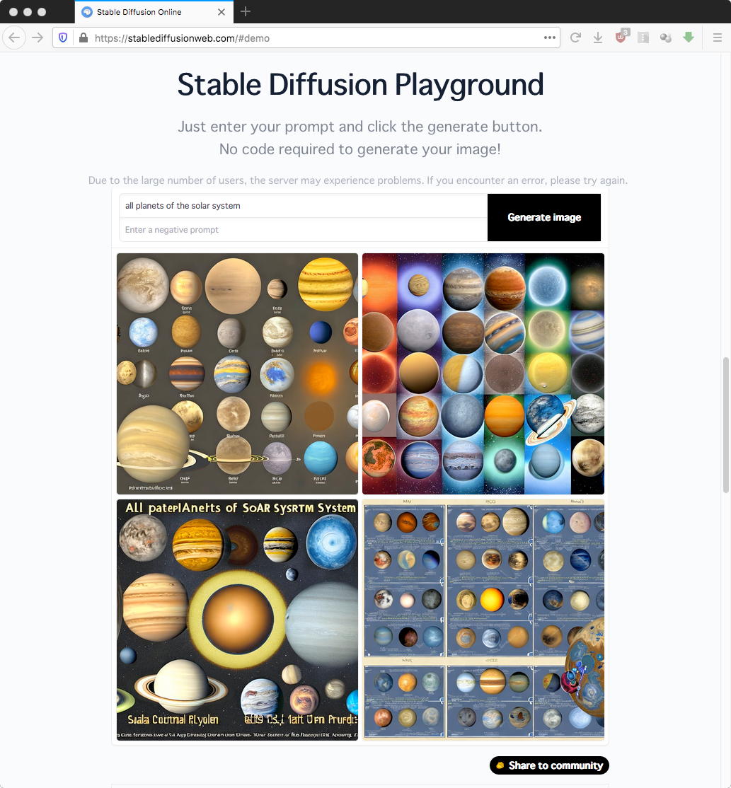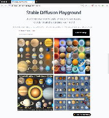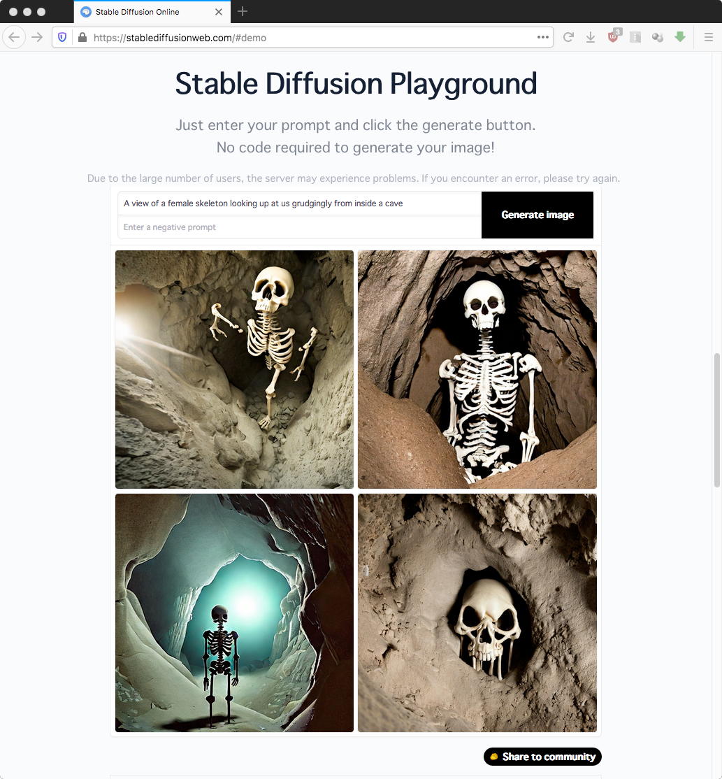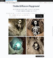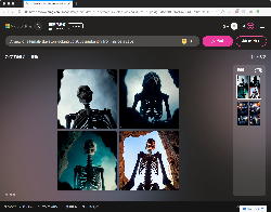 次の Stable Diffusion には「Get Started for Free」というのがあって、「all planets of the solar system」と入れると40秒ほどして上の左のような4枚の画像が出てきた。 これはあまりに図鑑/カタログっぽいので、ここでDeepL翻訳のサイトを開いて、「女性の骸骨が洞窟の中からこちらを恨めしそうに見上げている風景」=「A view of a female skeleton looking up at us grudgingly from inside a cave」というのを入れると、30秒ほどして上の右のような4枚の画像が出てきた。 うーむ、これはなかなかである。 この調子で、同一のキーワードでそれぞれの画像生成AIツールがどんなものを作るのか、これはなかなか面白い実験である。
