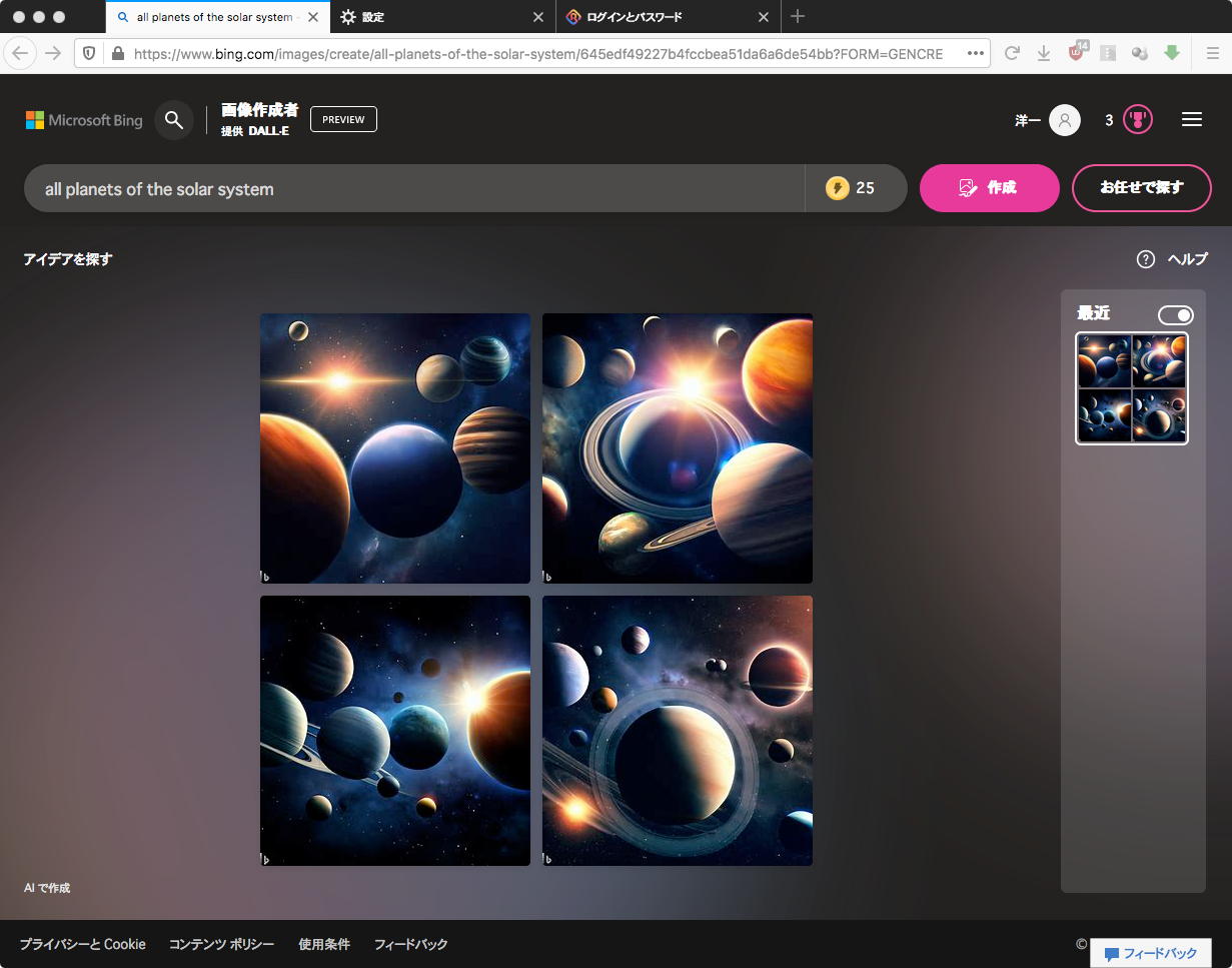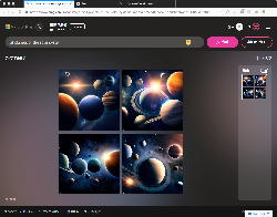 次の Bing Image Creator は捨てアドでもどこでもアカウントを作れば無料で使えたが、関連して色々と個人情報を提供させられた(^_^;)。 同じ「all planets of the solar system」と「A view of a female skeleton looking up at us grudgingly from inside a cave」というのを入れると、20秒ほどでそれぞれ上の左右のように4枚ずつの画像が出てきた。