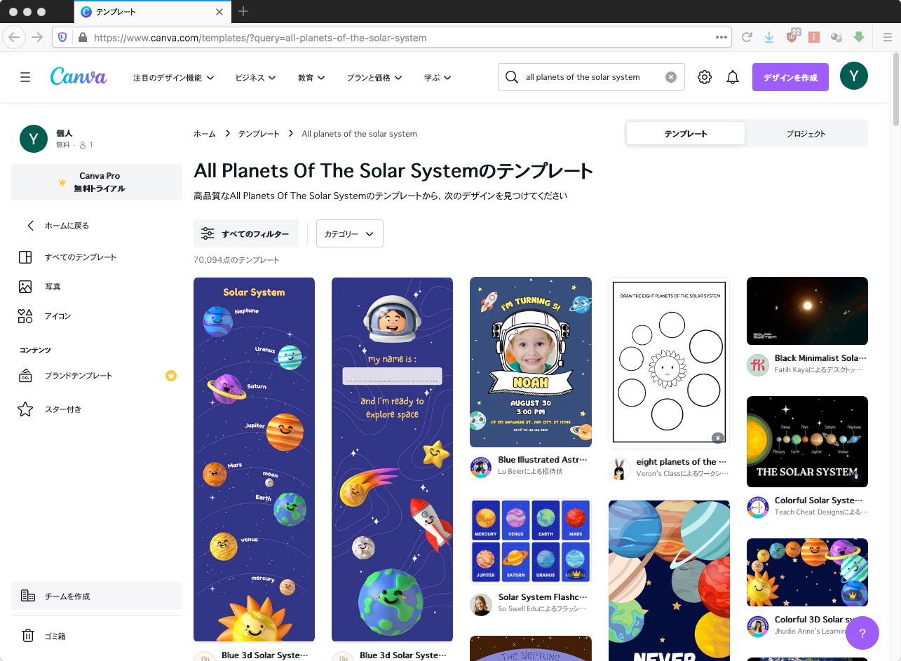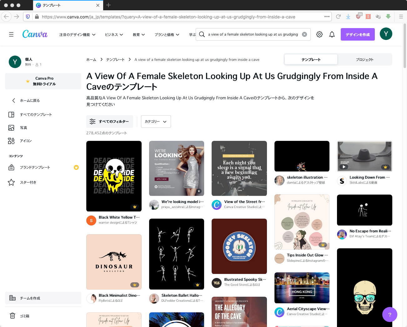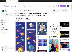 次の Canva というのは、Googleアカウントと紐付けて入れて無料でも画像生成できたのだが、同じ「all planets of the solar system」と「A view of a female skeleton looking up at us grudgingly from inside a cave」というのを入れて出てきたのはそれぞれ上の左右のようなもので、どうやらこのサイトはデザイナのためにお手軽なテンプレートを生成する・・・というところに特化している模様で、「画像作品を生成するAI」ではなかった。