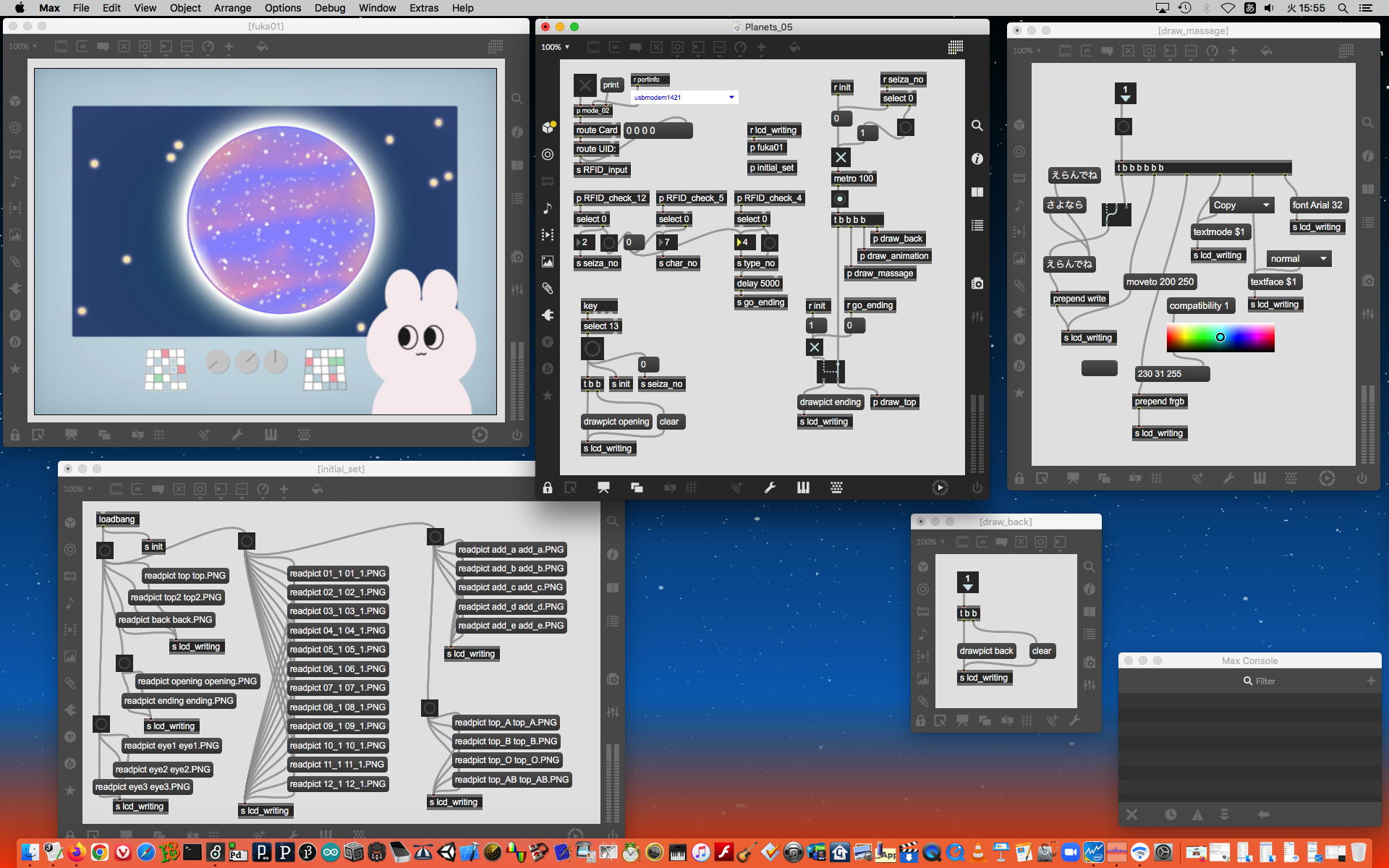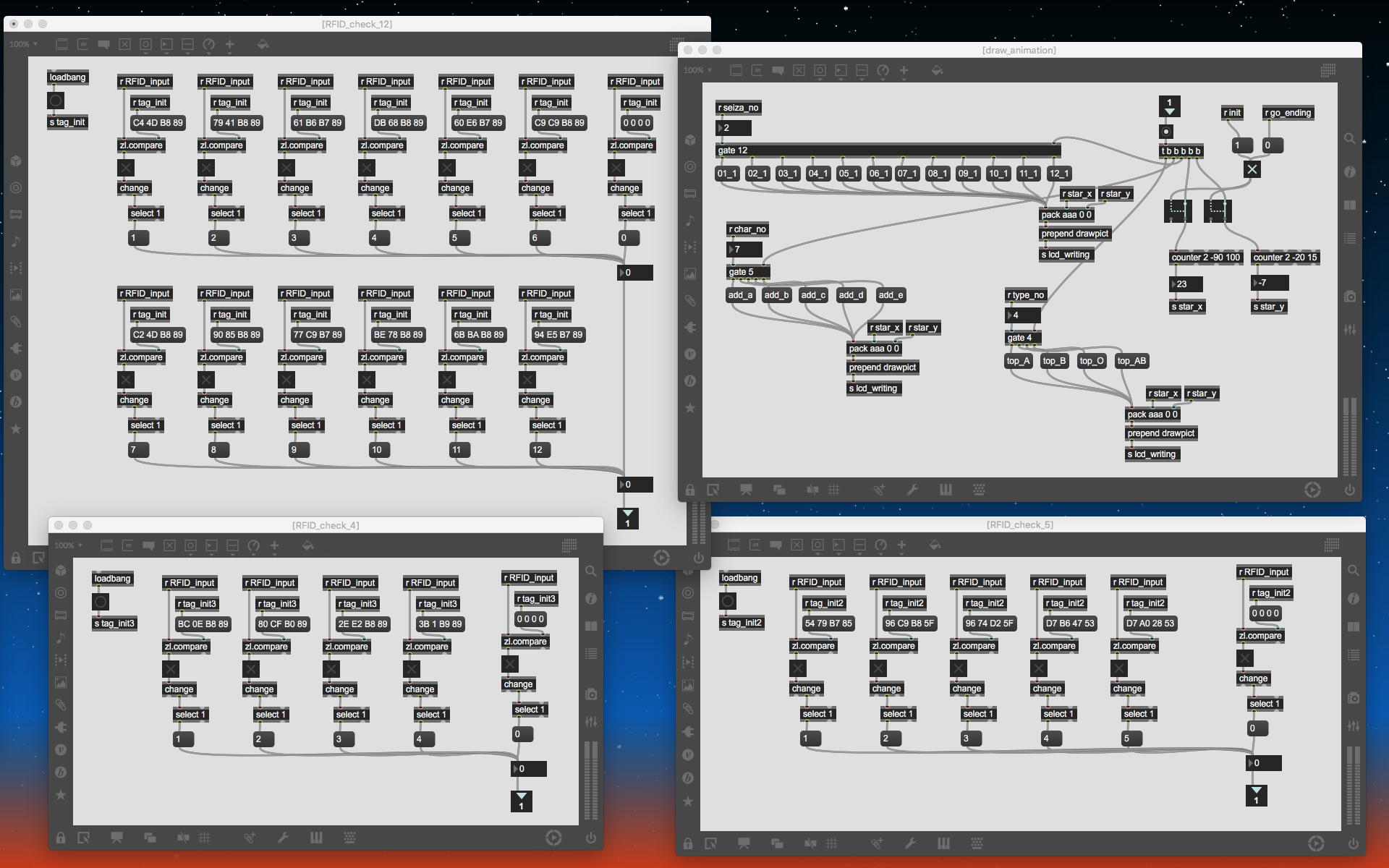 今日は午前に「基礎演習E」のゼミ・高木さんの作品をさらに進める日である。 「基礎演習E」の中間地点での成果提出期限がかなり早く設定されてしまったので、とりあえず作品に注力する必要が出てきたため、とりあえず「Max8お勉強」を棚上げして、多数の画像データをAirDropで受け取っては、以下のようにとりあえずの動作を実現するところまで作ってみた。 RFIDタグはこれまでで最大の、12+5+4=21枚を検出するということになった。 実際にはここにサウンドが加わることでグッとリアルなものになる、と期待できそうだ。