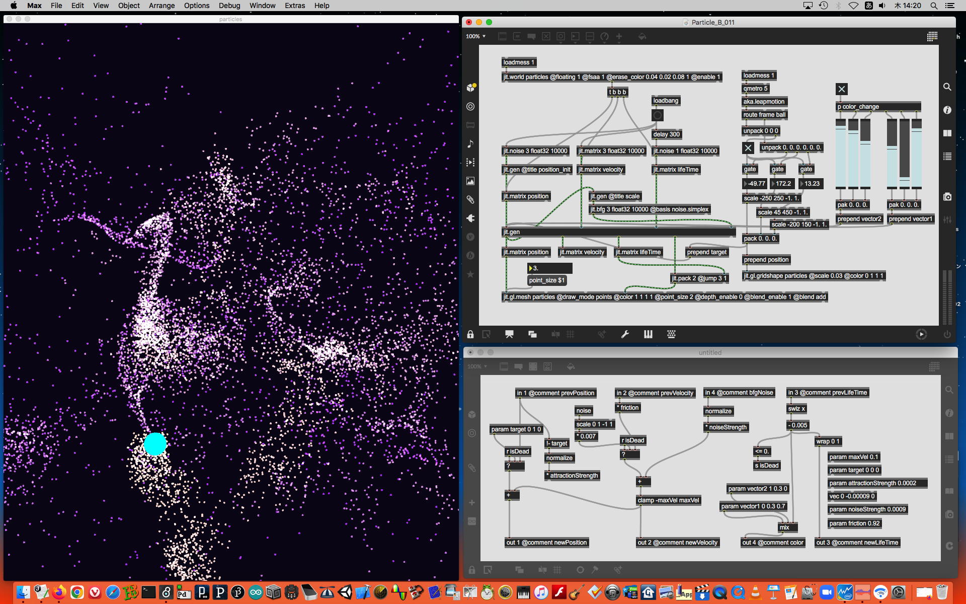 そして、午前から午後の3限まで(それ以降はデザイン学部とデザイン研究科の教授会)の時間に、昨日やりかけていた「Max8+Leapmotionでjitter/GenのParticle」という楽しい楽しいプログラミングの試行錯誤に没頭した。 結果として、以下のように各パーティクルが寿命に従って消えていく間に色彩変化を伴うようなバージョンが完成して、「パーティクル誕生時」と「パーティクル消滅時」の色をRGBの連続値で変えられる(自動変化もアリ)というものが完成した。 これでようやく、来週月曜の王さんのアポに見せられるものが出来た。