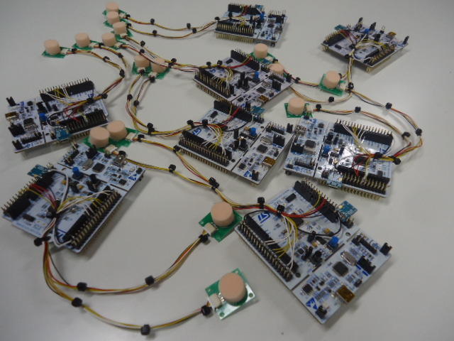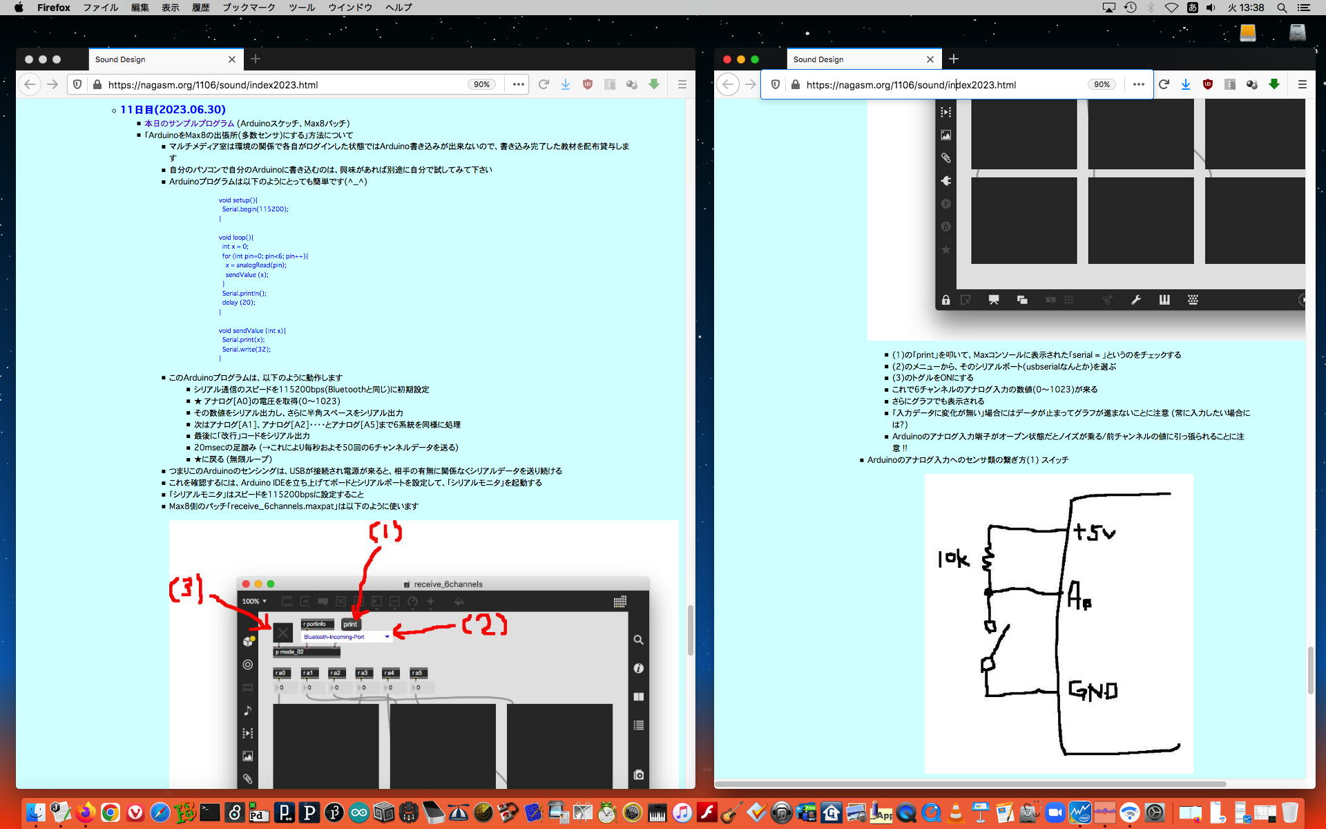 そして4限には、M2の王さんがやってきて このように 新楽器に向けて、半田付けがさらに進展した。 20個の「穴」に光センサを取り付けて、Arduino Microからとても変則的なMIDI情報としてMax8に送ることで、見事に「20個の穴の上空をパチンコ玉が通ると20個並んだトグルがそれぞれ対応してONになる」という動作までは簡単に実現できてしまった。 これで、僕が渡英している来週にレーザーカッターでアクリル加工して、上空の4つのSHARP距離センサを取り付ければ、いよいよ「新楽器」が完成に向かうことになる。