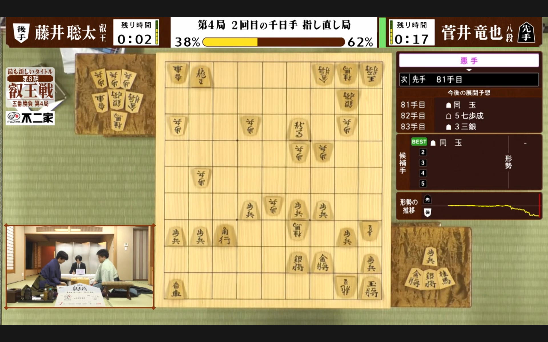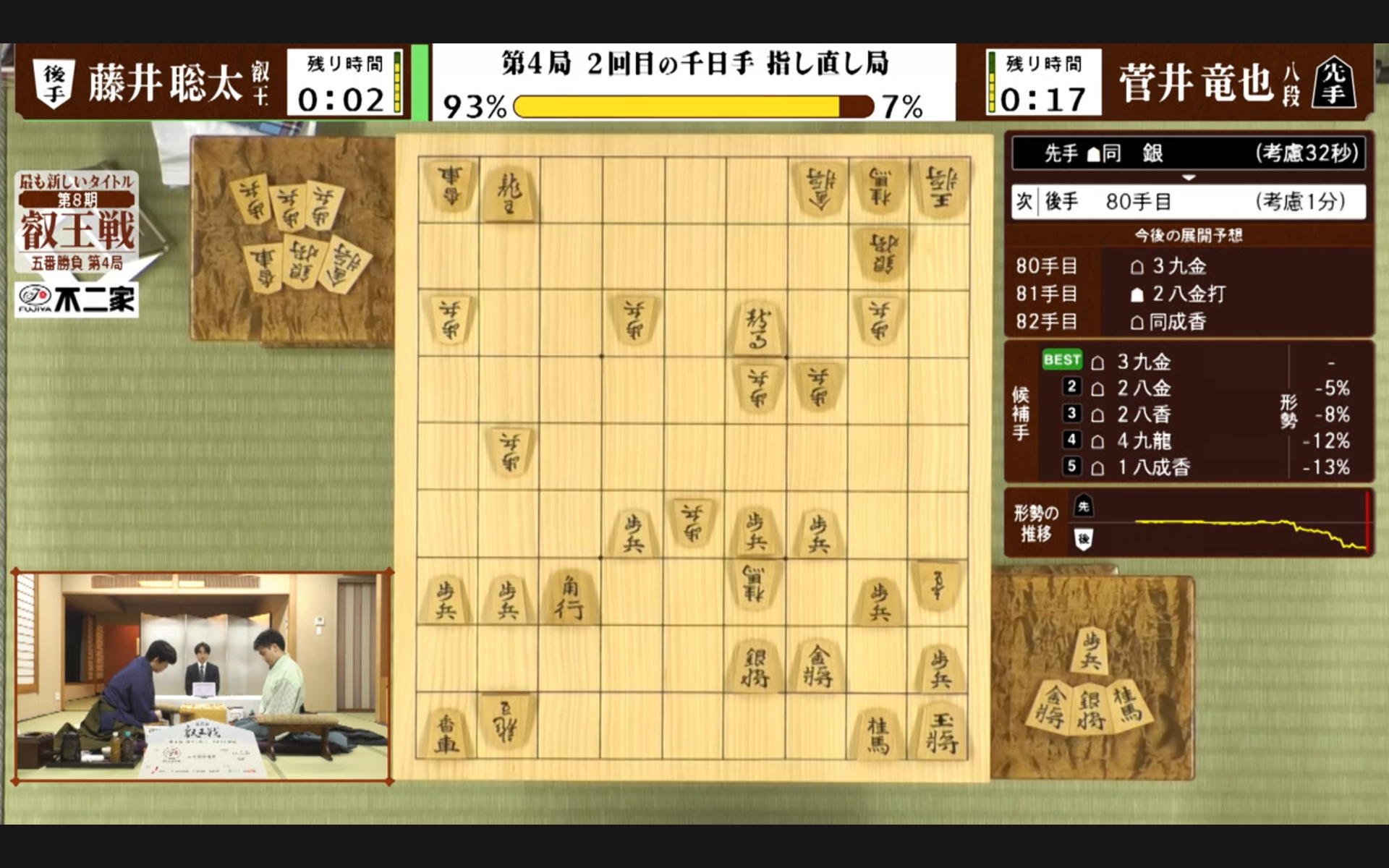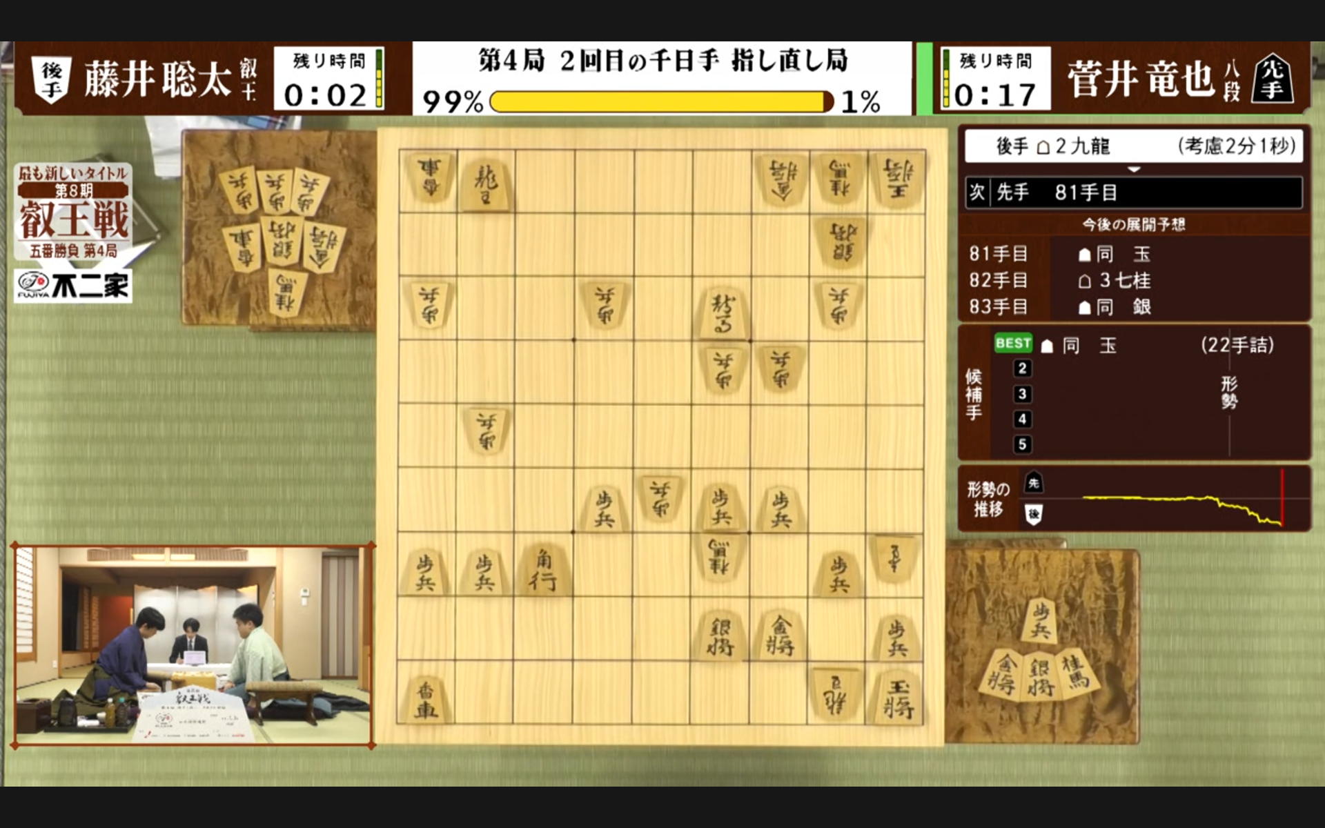 ところが叡王戦の挿し直し局は終盤まで熱戦が続くものの終わらず、AIの推奨手の第2位には再び千日手に至る手が出てきたりしていたところで帰宅した。 そして今朝になってみると、なんと挿し直し局でも千日手となり、再びの千日手挿し直しのデスマッチとなった末に藤井叡王が勝って防衛した・・・という事を知った。 そこで今朝は研究室に出てきてAbemaTVで終盤のところを眺めてみると、なんと優勢だった藤井6冠が2九龍と打った瞬間にAIは「悪手」と逆転の判断をして、その直後に実は藤井6冠が23手詰めで終局に向かって一直線だったことをようやく「発見」して、そこから再び優勢に触れていた。