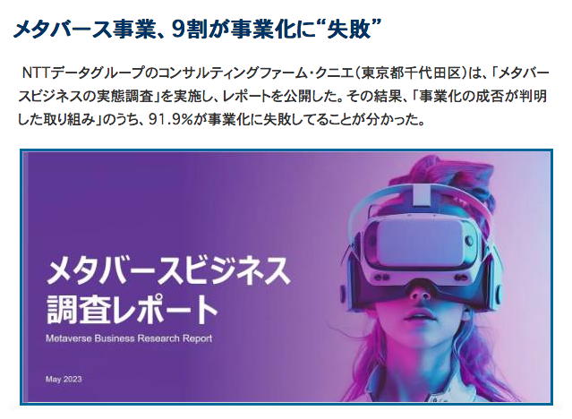 ネットのニュースで「メタバース事業、91.9%がが事業化に“失敗”」というのが流れてきたが、逆にメタバースで成功している「8.1%」というのが本当にあるのか? というのが盛り上がっていた。 「成功事例を見たことがない」・「当たり前」・「セカンドライフで学習してない」・「ロマンはあるが効率悪い」・「やろうとした事自体が無能」・「補助金を目当てにやってるふりしてる」・「内閣府肝いりのアバター社会 オワタ\(^o^)/ 」・「東大のメタバース工学部はどうなる?」・「言い出しっぺのメタ社自身がメタバースから手をひこうとしてるのに」・「成功したのはメタバースという言葉の普及だけ」などと5ちゃんは辛辣だが、僕は最初からこの状況を確信していた。 左右の視力差が大きくてHMDが無理なので、「3Dテレビ」と同様に、最初からこれは無理ゲーなのだった。