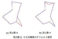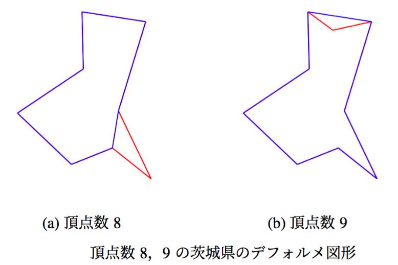 都道府県の輪郭を頂点数を減らして表現するデフォルメ地図の認識についてモデル化したもので、なかなか面白い気がした。 以下の例は茨城県だが、人間がどの特徴に注目しているかに関係しそうだ。