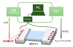 「怒り」・「嫌悪」・「恐怖」・「喜び」・「悲しみ」・「驚き」の6種の表情と、「軟(ふわっと)」・「温(ぽかぽか)」・「乾(ぱさぱさ)」・「冷(ひんやり)」・「湿(じめじめ)」・「熱(あつあつ)」・「硬(がちがち)」・「凸(つんつん)」・「痛(ぴりぴり)」の9種の触感との対応を共感覚的表現として調査した。 その結果は、「怒り」の表情と「冷・硬・凸・痛」とが対応し、「嫌悪」の表情と「硬・凸・痛」とが対応し、「恐怖」の表情と「硬・凸・痛」とが対応し、「喜び」の表情と「軟・温」とが対応し、「悲しみ」の表情と「冷・湿・痛」とが対応し、「驚き」の表情と「乾・熱」とが対応していると確認されたらしい。 しかし、「喜び」の表情と「軟・温」との対応はpositiveであるものの、あとは悉くnegativeというのはいかがなものか。(29)透明なゲルを用いた柔らかい入力インタフェースに関する検討