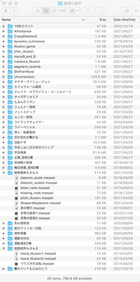 一昨日の金曜日から、いよいよ「基礎演習E」は後半の個人制作(まずは企画案)のフェーズに入った。 今年はどんなブロジェクトを支援することになるのか、楽しみな期間なのだ。 また「領域専門演習」も先週で前半パートが終了したが、後半には僕の担当する学生はいないので、ちょっと余裕ができることになる。 ちょうどゼミと共に「基礎演習E」の制作支援の期間となるので、まずまずのバランスである。 「音楽情報科学」の個人指導をしていた小野山さんも、音楽理論特訓講座が終了して、ここから後半は「マルチメディア知覚」に関して、まずは色々な錯覚を調べたりMax8で実装したり・・・というフェーズに突入する。 多数のMaxパッチのうち「基礎心理学」というディレクトリにまとめたものは以下のようにだいぶ増えてきたので、題材には事欠かない。