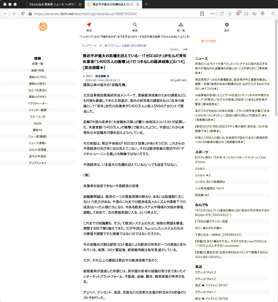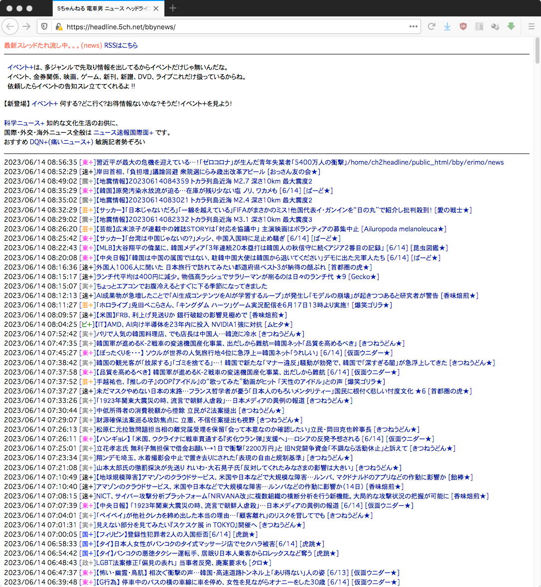 今日はゼミの日、4コマ埋まっている金曜日と並んで、朝から気合いの入る日である。 いつものように朝のルーティン(脚回し2千回、腹筋ローラー2百回)を終えてパソコンを覗いてみると、なんと「5ちゃんねる」(旧2ちゃんねる)のニュースヘッドラインはこれまでと同じ(左)だったのに対して、それぞれのスレの表示がまったく新しくなっていた(右)。 これはここ10数年で初めて遭遇した画期的なことであり、もしかするとスグに元に戻るのかもしれない。 なんだかとっても見にくく/醜くなったので、いよいよ5ちゃんねる巡回からも断捨離せよ・・・というお告げなのかも。