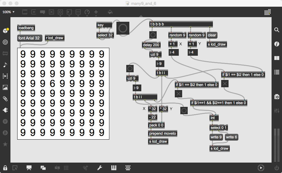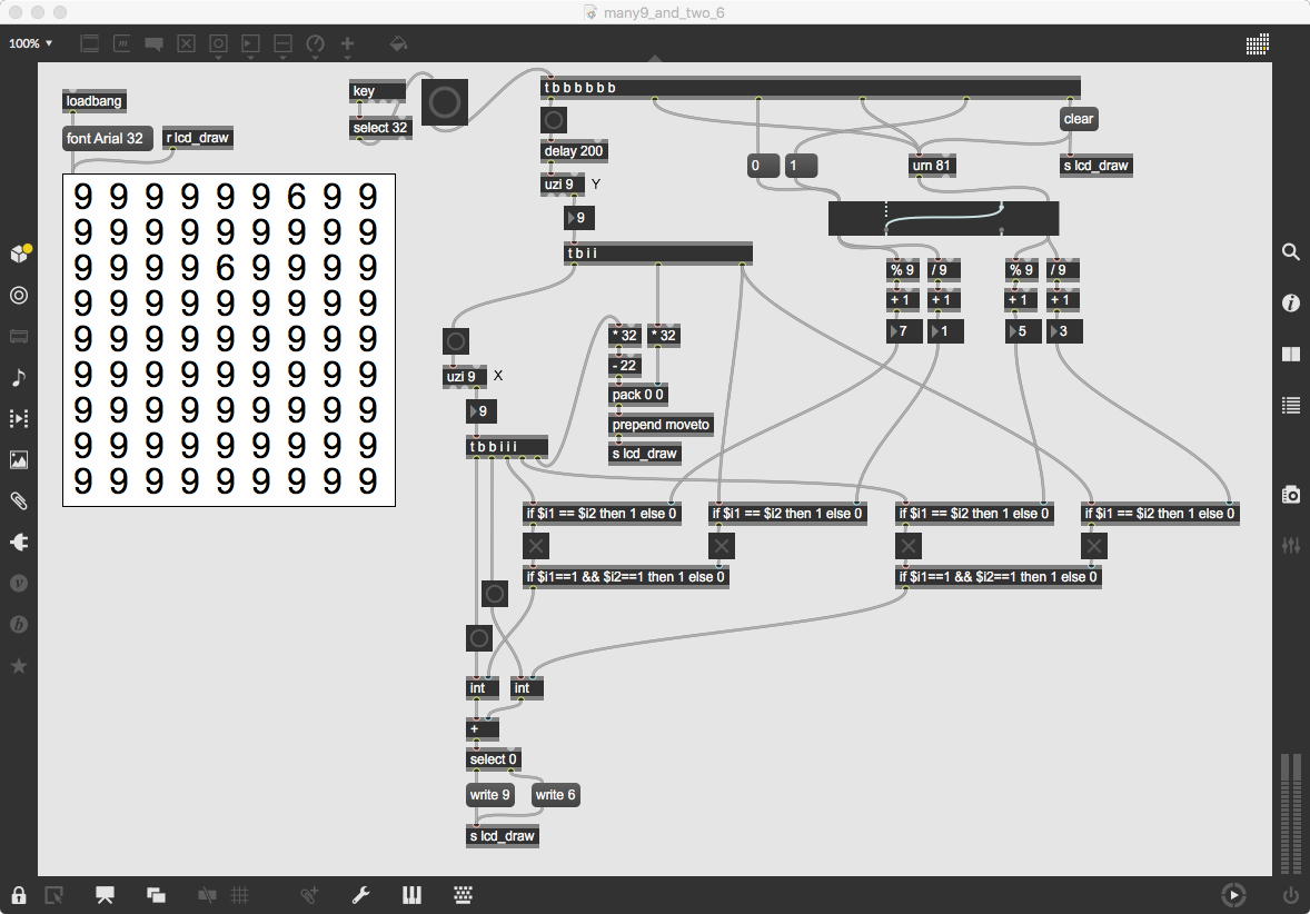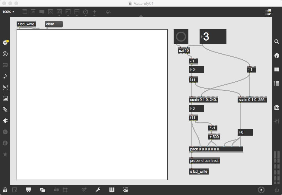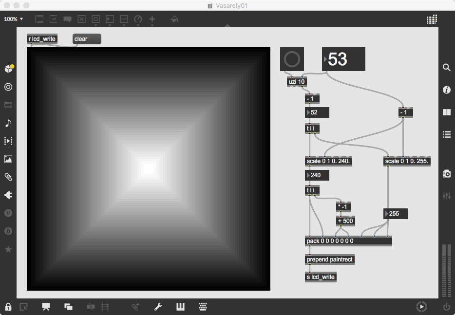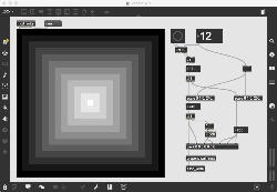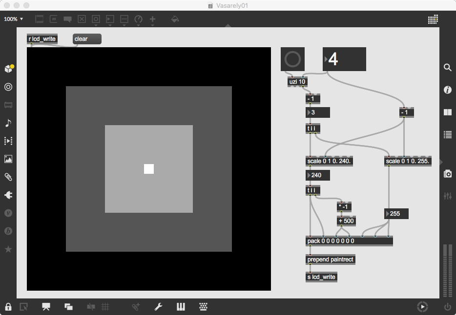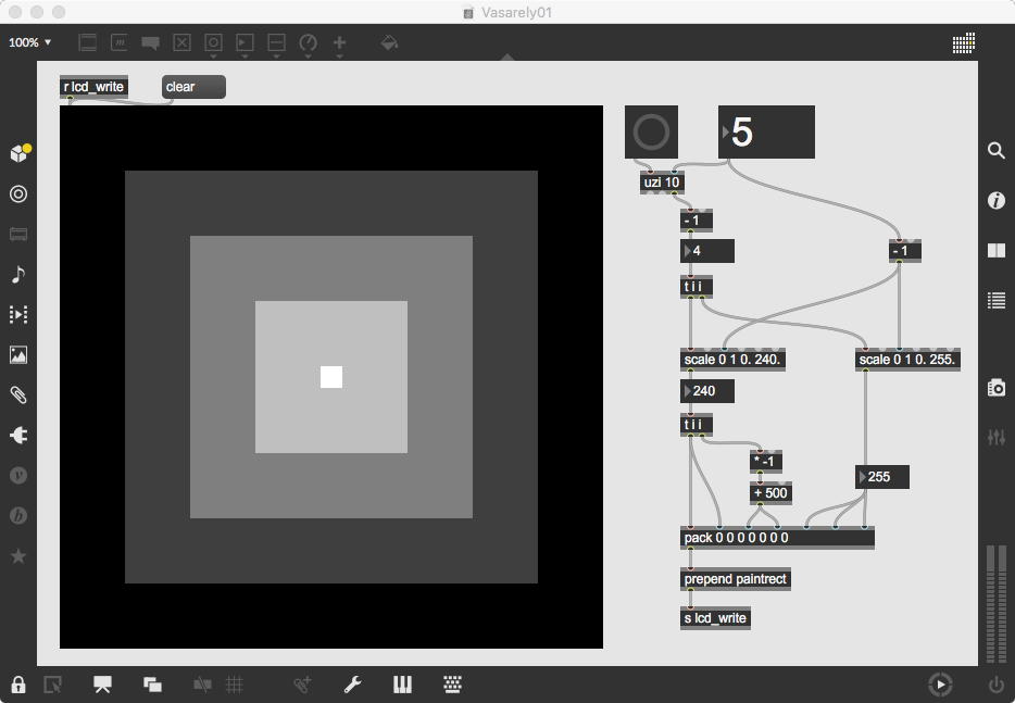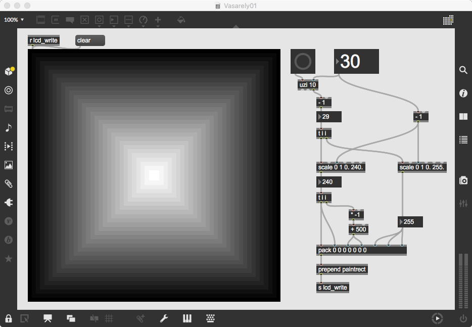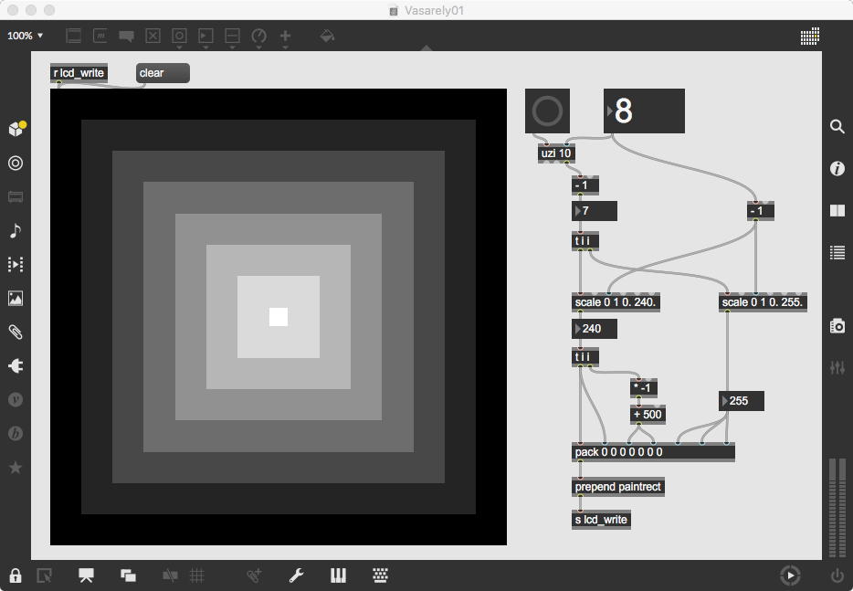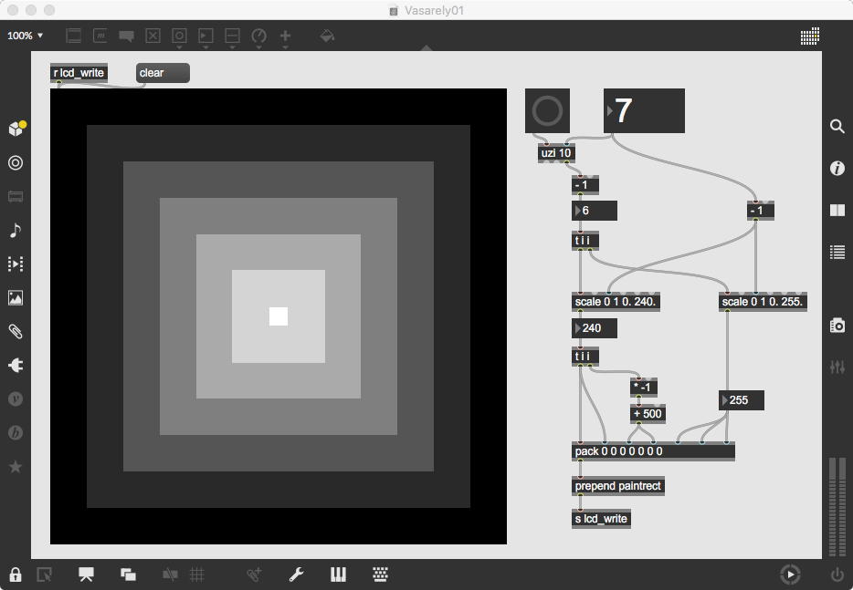 2限の「音楽情報科学」では、小野山さんが イリュージョンフォーラム の色々な錯覚を調べて、特に気になったものとして ヴァザレリ錯視 というのを取り上げてきた。 ここで紹介されていたのは3種類の静止画だけだったので、これを「任意の段数に変化できる」というMax8パッチを作ることにした。 そして小野山さんが苦闘している横で僕も作り始めたところ、10数分で出来てしまったので、このパッチの動作を理解して「uzi」を使えるようにすること・・・という宿題となった。 たったこれだけのパッチで出来るという好例となっていて、「uzi」が自在に使えたらMax8のプログラミングとしては中級以上なので、これはいいチャレンジとなった。