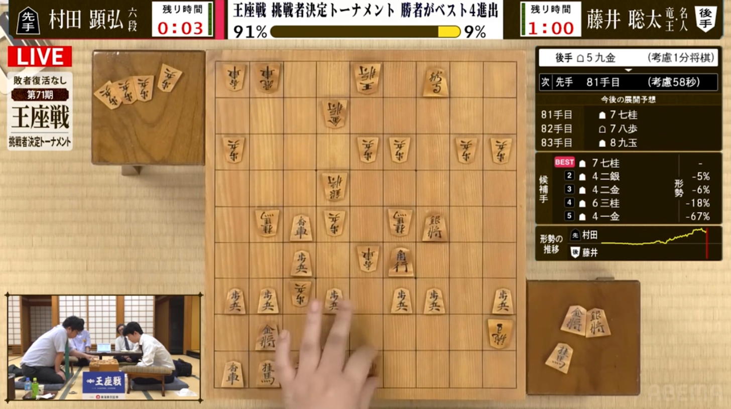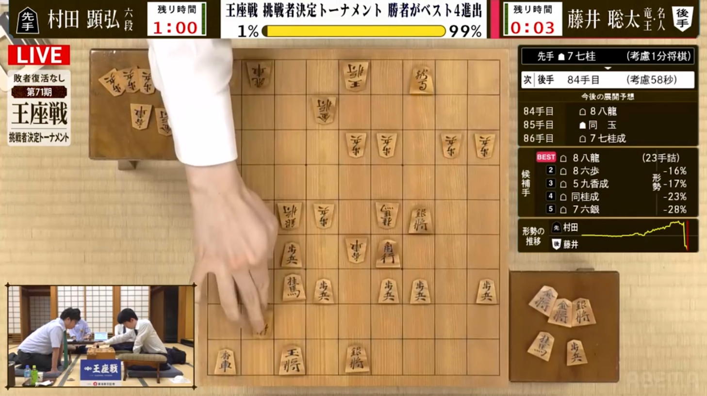 昨日は王座戦挑戦者決定トーナメントがあって、「村田システム」を駆使する村田六段が優勢というところで帰宅していたが、今日になってみると『「なんですか、これは…」藤井聡太竜王・名人の勝負手&逆転勝利に解説陣絶句、ファンは大熱狂「評価値おばけフォーク」「ナイアガラの滝w」』という記事に驚いて 棋譜 を追いかけ、 このページ にも追記することになった。