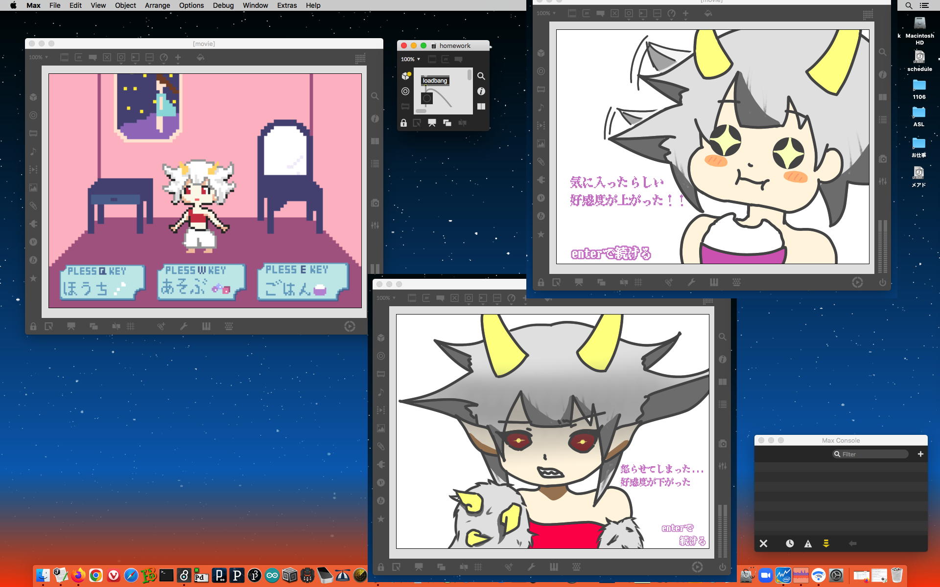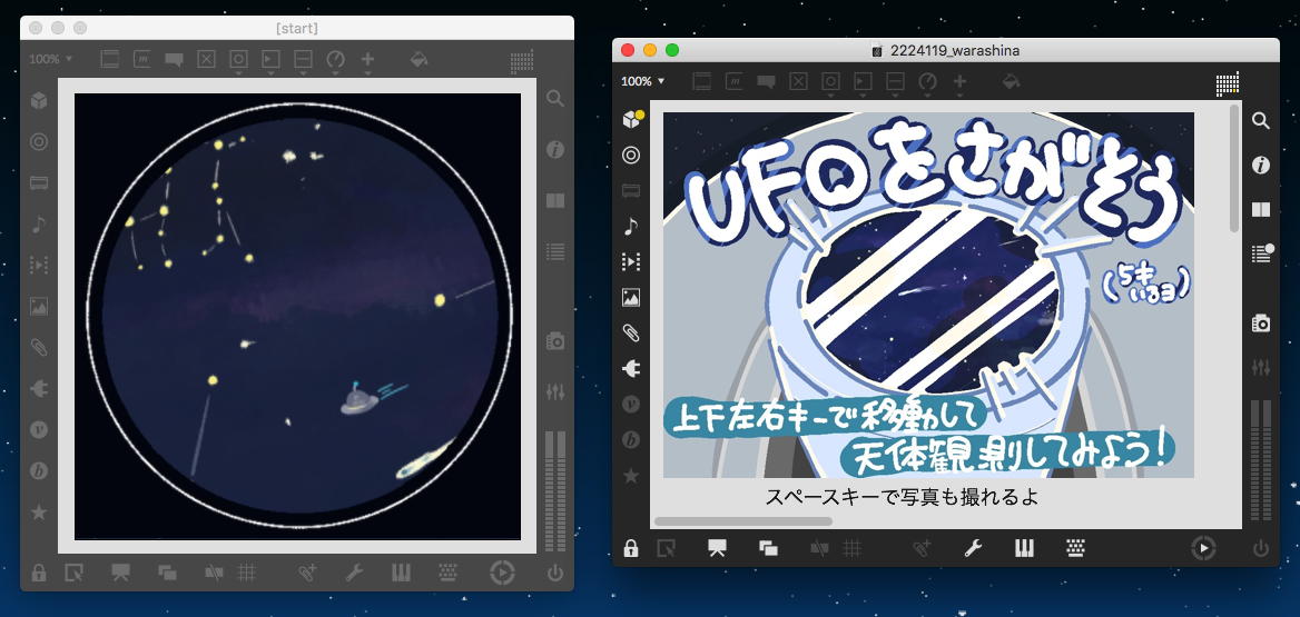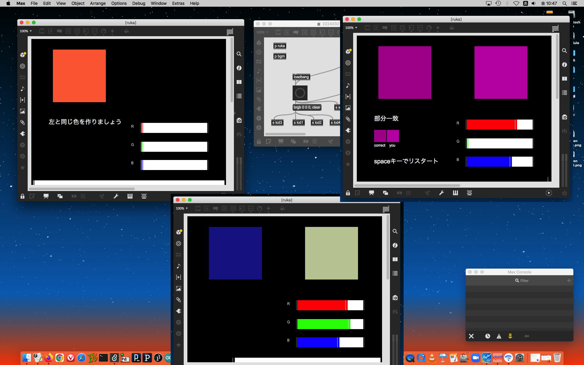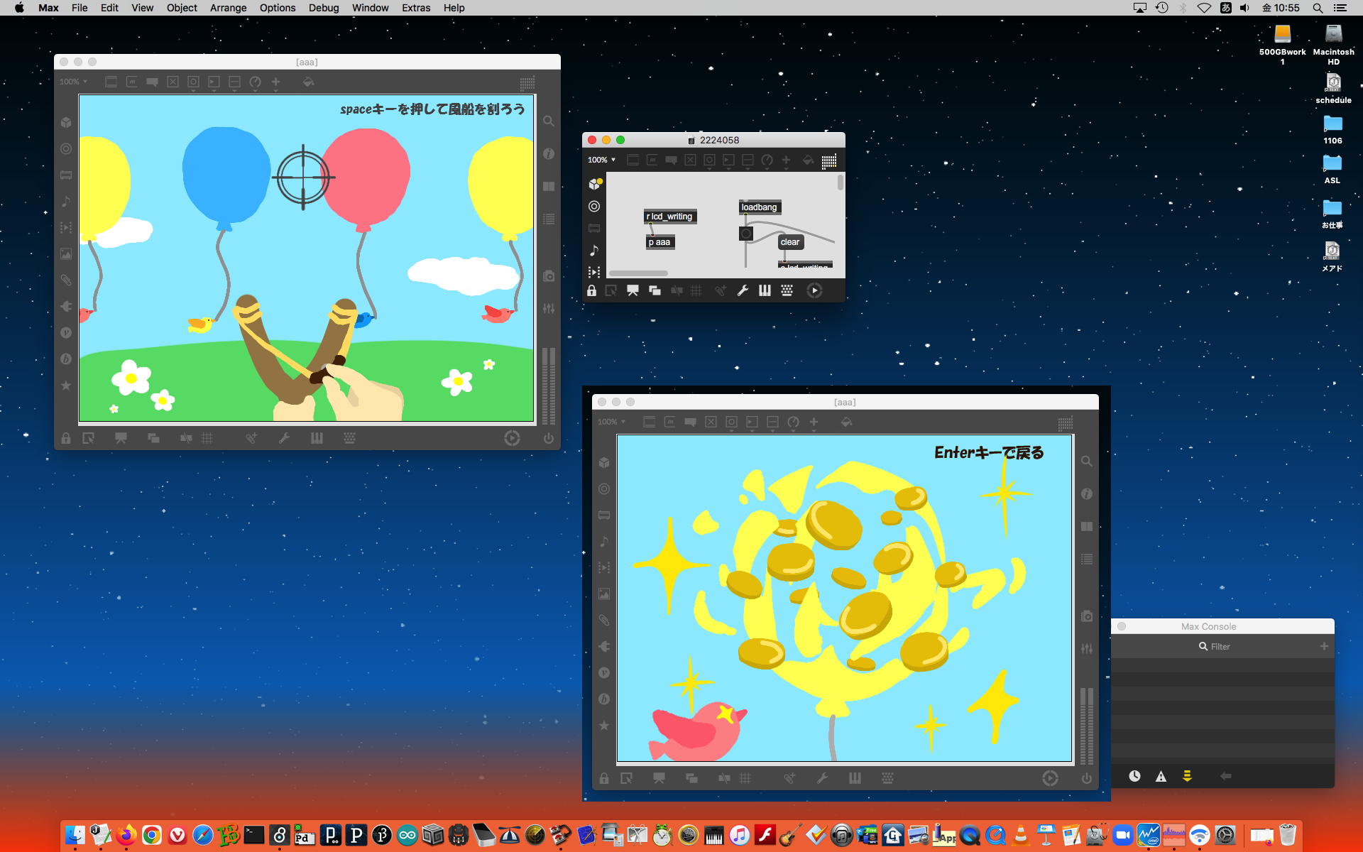 そして午前には「領域専門演習」の最終回として、ゼミの高木さん作品の追い込みを このように 進めた。 僕のMacBookAirのMax8でbuildしてアプリケーションに書き出したものは高木さんのMacBook(ほぼ最新)でも動いたものの、一部に謎の不具合があったので、これは今週のゼミと別途アポでの動画記録(→課題提出)の後に再度チャレンジすることにした。 だいぶ応援したものの、ここまで一人で進めたのは、大したものなのだ。(^_^)