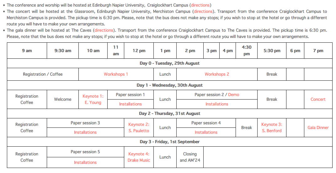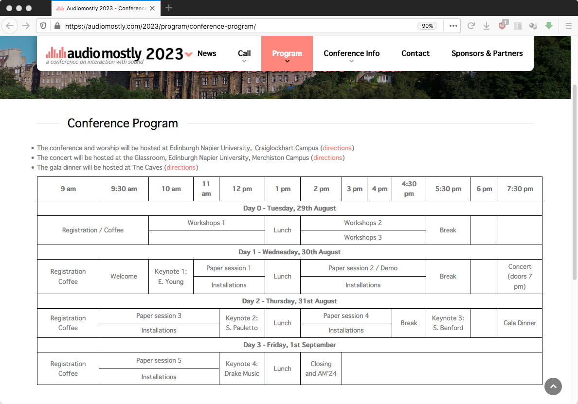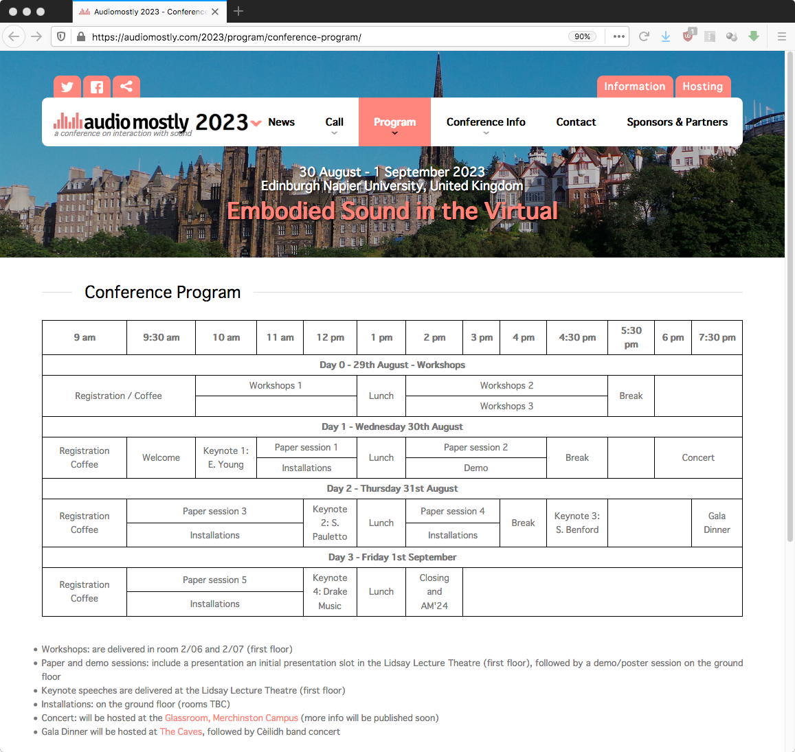AM2023はいよいよ直前ということで、ようやく プログラム に上のような「開催される部屋」の情報が加わった。 一応ローカルに保存したものは これ である。 あとは、インスタレーション展示会場の僕のスペースに「張り紙」が必要になるので、その文面と実際のプリントアウト作業に取り掛かった。 事前にスタッフに確認していた内容は「In this schedule, "Installation" session time seems parallel with paper 1-5. However, I cannot stay all "Installation" time-slot at the exibiting place because I want to join the paper sessions. So, like as other conferences, I will set the message at my exibition place - "This installation will be open only at these date/time : ###". At that announced time slot, I will stay with my interface and my computer and I will explain/assist to demonstration/experience of my work. Please accept this style.」というものであり、素早く届いた回答は「Yes, That's completely fine. Please, feel free to manage the installation as you wish during the conference. Traditionally, the installation track is a parallel track. The good thins is that the paper session and the installation rooms are very close to each other.」というものであり、これが今回の情報で確認できたのだ。