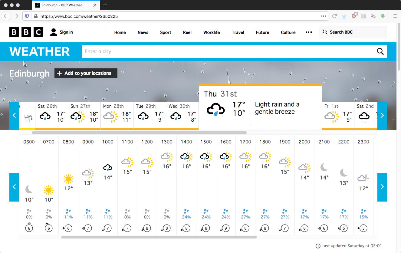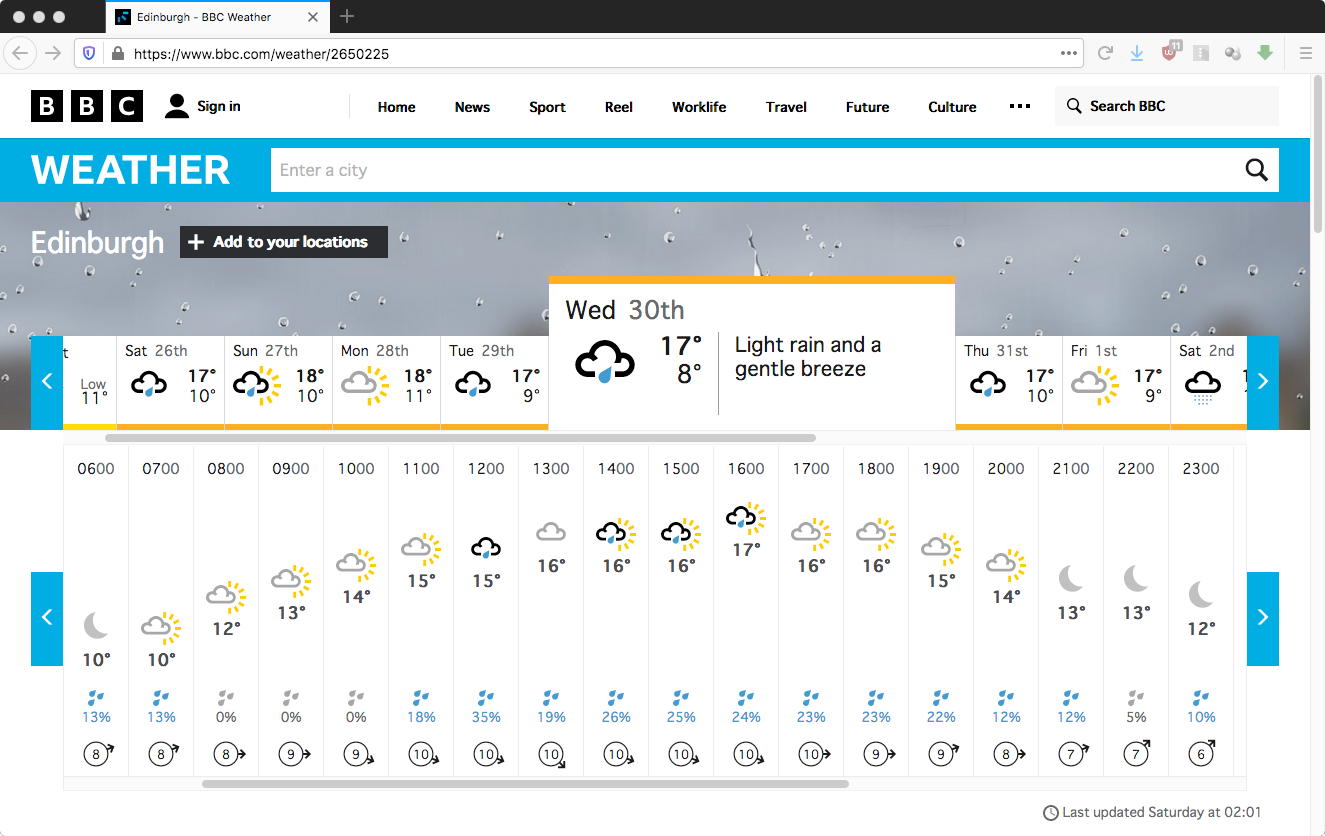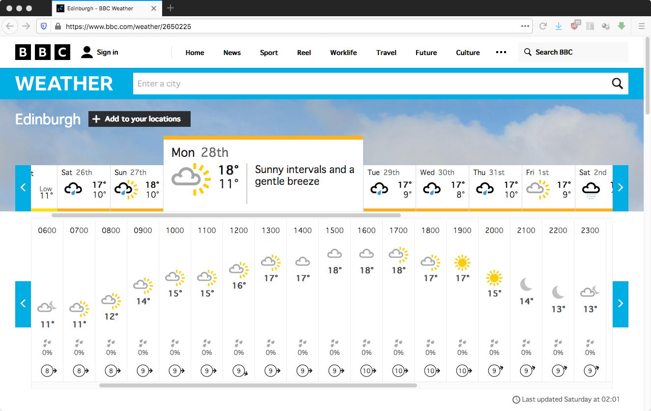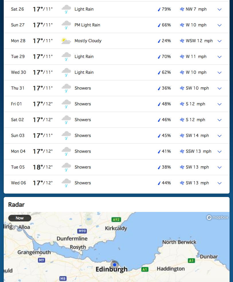 渡英出発(といってもフライトは明日の朝)の日である。 昨日は週2の「ギター弾き」をしたり、JoyJoyヒトカラ6時間59曲、といういつもの週末だった。 ちなみに これは、 いつも持参して歌った曲を塗りつぶす(さっき歌ったのに忘れてまた歌うという痴態を避けるために必須)マイリストであり、前回(1列目)と今回(2列目)を塗りつぶした これがこの2週の成果である。 重複は声馴らしの定番曲とウクライナ反戦歌の2曲だけであり、まだまだ重複せず歌いたい曲が100曲ほど残っている。 そして以下は今月の成果であり、それ以前の情報はこの日記の「2023年7月30日(日)」から辿っていける。そんな昨日は、この日記の過去の部分を眺めて些細なバグを修正したり、改めてEdinburghの天気を確認したりした。 「2023年8月23日(水)」のところにあった「10日間天気」 ★ だと、なんか毎日「雨模様」で陰鬱な感じだったが、以下のように1日の推移予報を見てみると、雨が降るのはごく一時的なものであり、寒いとしても晴れ間もけっこうある事が判明した。 これはちょっとだけ、朗報である。