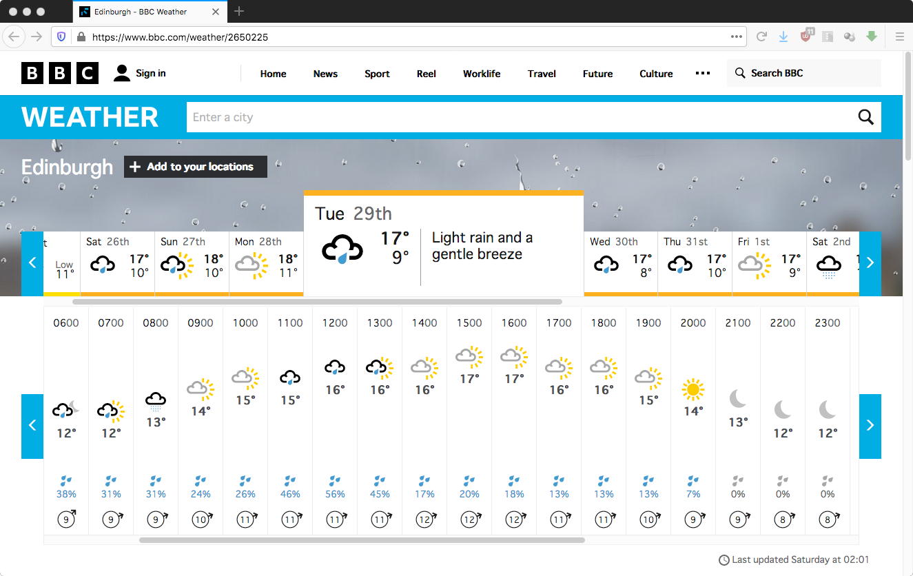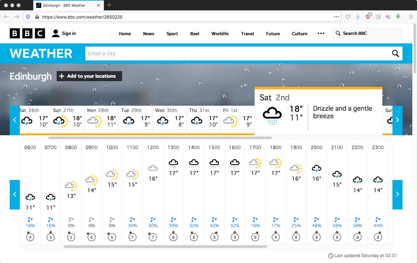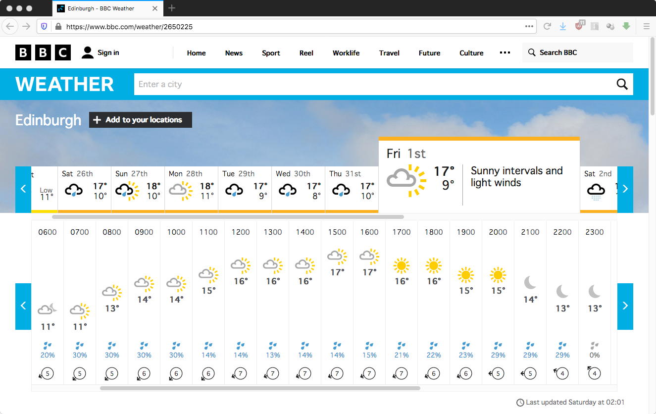 渡英出発(といってもフライトは明日の朝)の日である。 昨日は週2の「ギター弾き」をしたり、JoyJoyヒトカラ6時間59曲、といういつもの週末だった。 ちなみに これは、 いつも持参して歌った曲を塗りつぶす(さっき歌ったのに忘れてまた歌うという痴態を避けるために必須)マイリストであり、前回(1列目)と今回(2列目)を塗りつぶした これがこの2週の成果である。 重複は声馴らしの定番曲とウクライナ反戦歌の2曲だけであり、まだまだ重複せず歌いたい曲が100曲ほど残っている。 そして以下は今月の成果であり、それ以前の情報はこの日記の「2023年7月30日(日)」から辿っていける。そんな昨日は、この日記の過去の部分を眺めて些細なバグを修正したり、改めてEdinburghの天気を確認したりした。 「2023年8月23日(水)」のところにあった「10日間天気」 ★ だと、なんか毎日「雨模様」で陰鬱な感じだったが、以下のように1日の推移予報を見てみると、雨が降るのはごく一時的なものであり、寒いとしても晴れ間もけっこうある事が判明した。 これはちょっとだけ、朗報である。