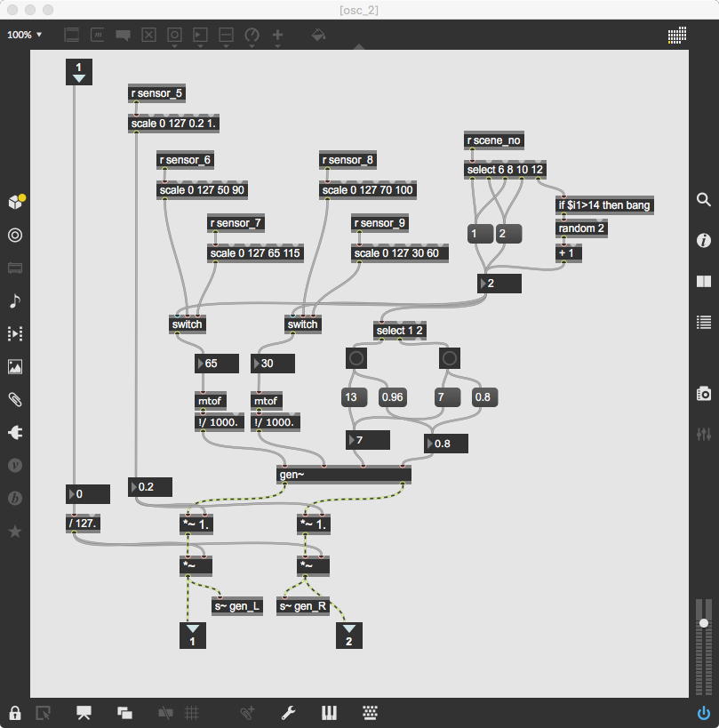- 新楽器の演奏行為によって即興生成されるサウンド (プレゼンでは「センサ入力を記録したMIDIファイル」にてemulation再生)