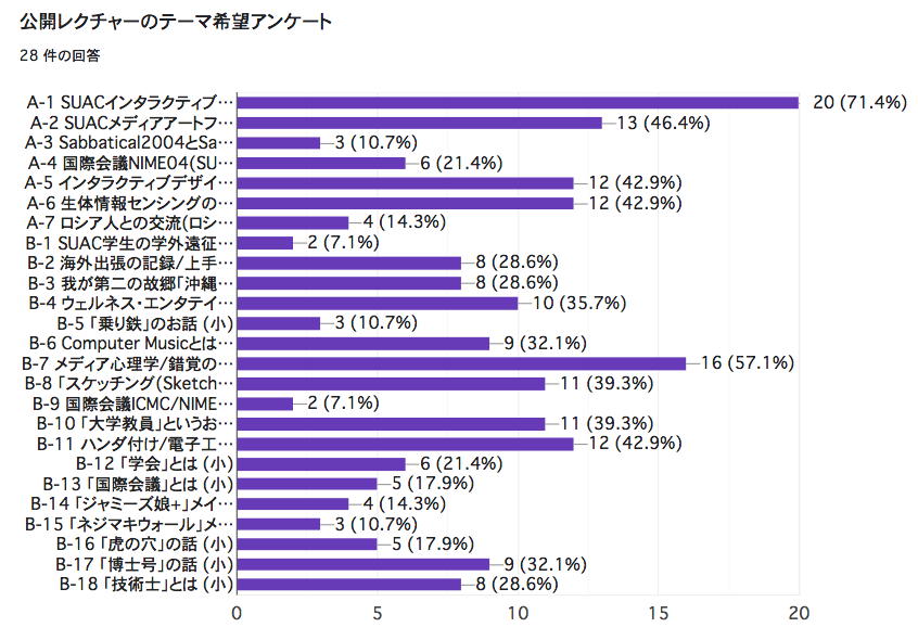 新しい週となって、いよいよイベントまで2週間を切って、「直前モード」に入ってきた。 昨日はJoyJoyヒトカラ6時間で、先週の62曲とは6曲だけカブりの60曲を完走して、心地良い疲労感も残っている。 今日は Final Lecture/Workshop by YN の Googleフォーム のアンケート締め切りと設定していたが、さらに新しい記入が2人あって、計28人となった。 そこでさっそく、アンケート結果も Final Lecture/Workshop by YN の中に入れ込んで、あちこちを改訂してみた。